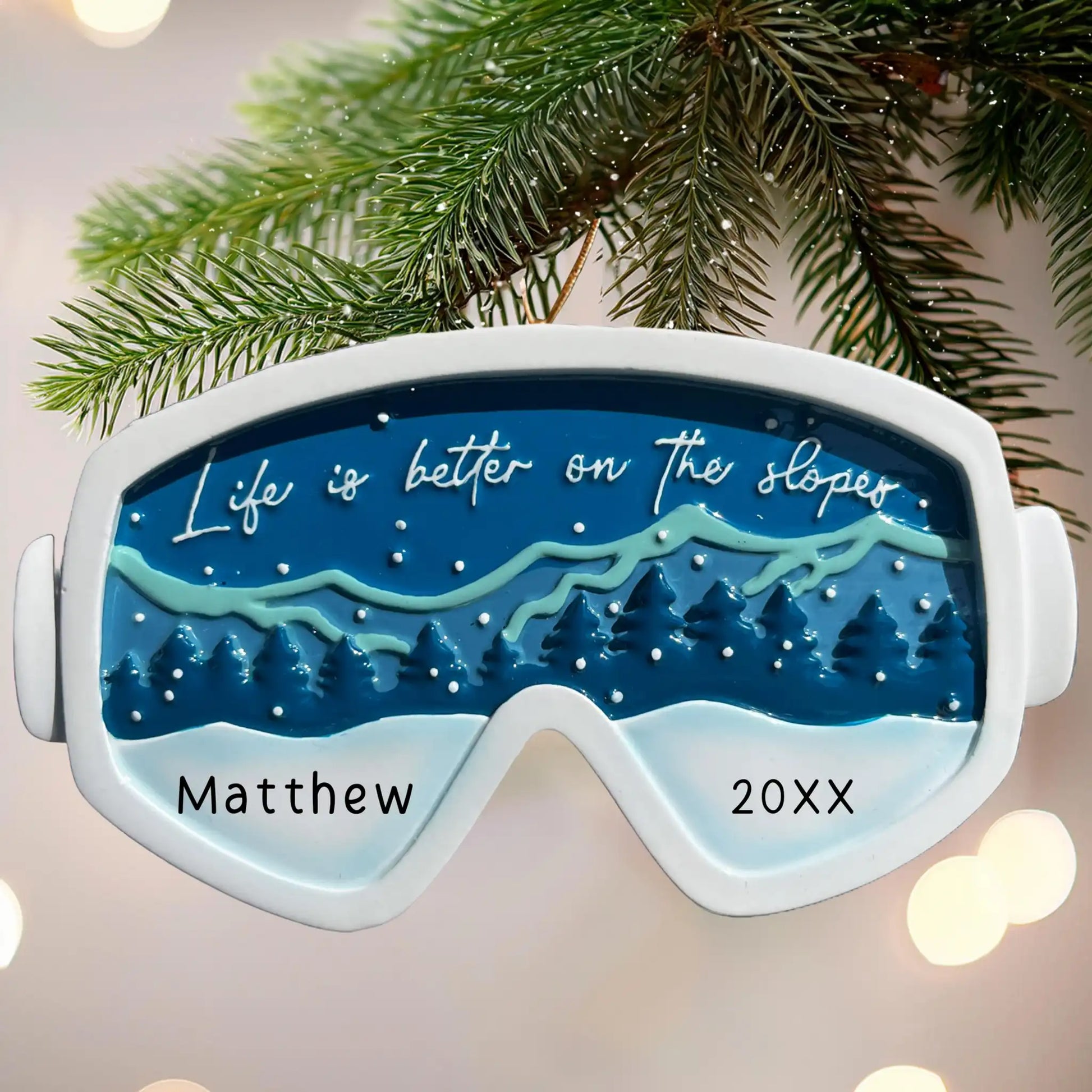 For anyone who feels most alive carving through fresh powder, this ski goggles ornament captures the magic of a perfect winter day. The deep blue lenses reveal a peaceful snowy mountain scene with pine trees, falling snow, and the phrase Life is better on the slopes. It is ready to personalize with a name and year for the skier or snowboarder in your family.