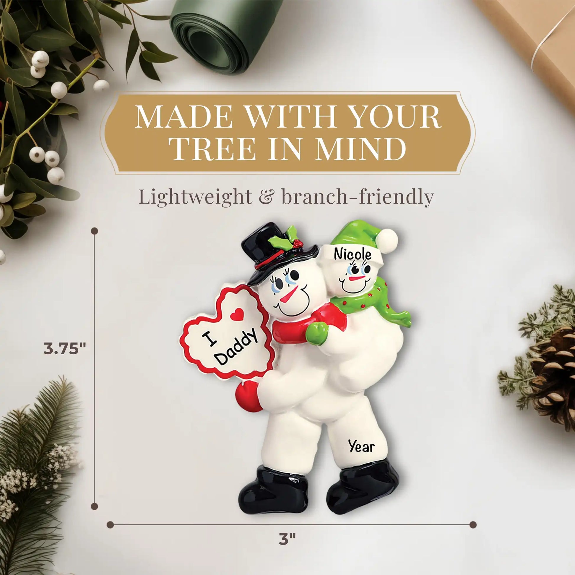 This cheerful snowman ornament highlights the sweet bond between a father and child. The design features a smiling snow-dad carrying his little snow-kid, both bundled up in festive scarves and hats.