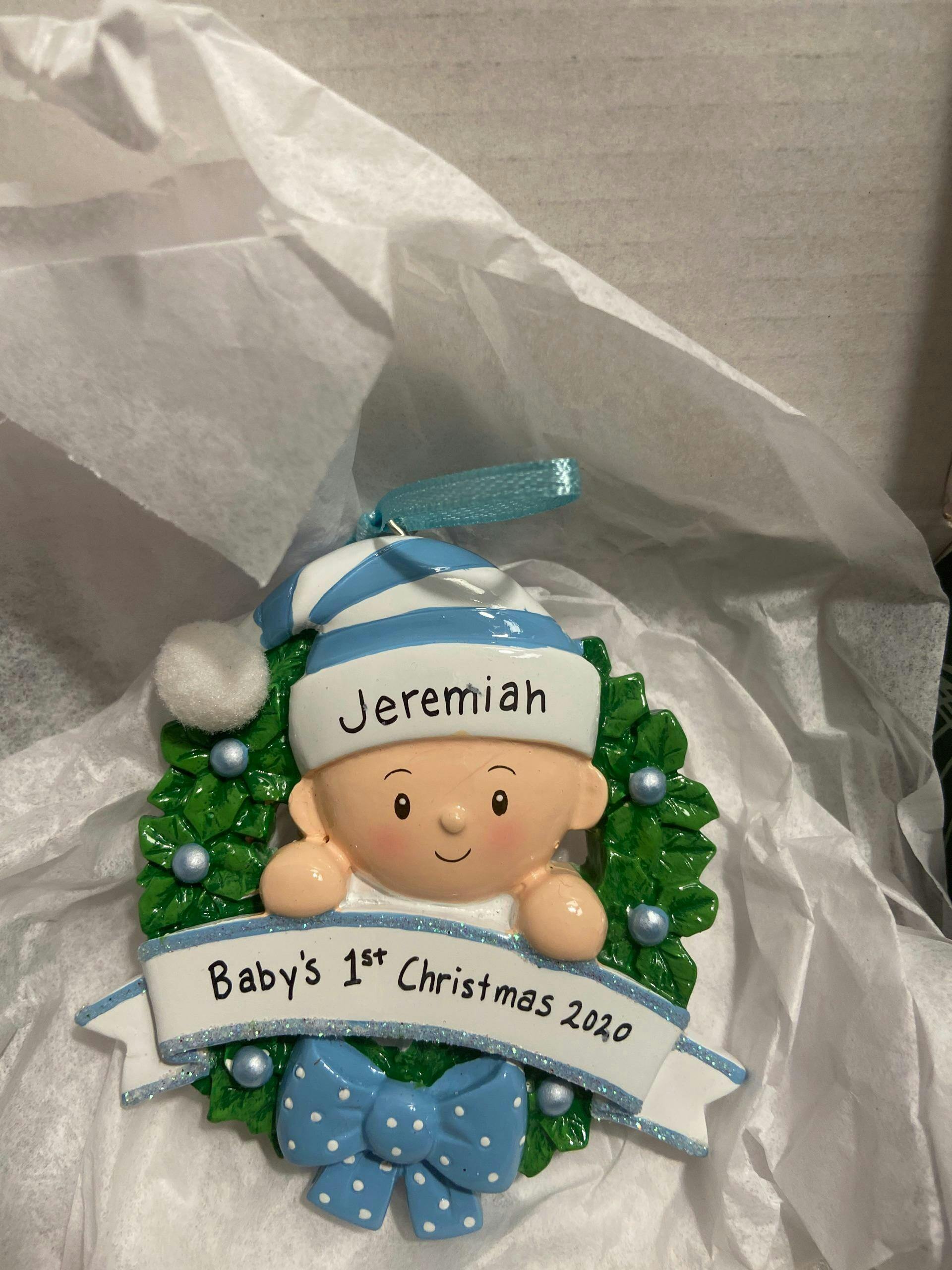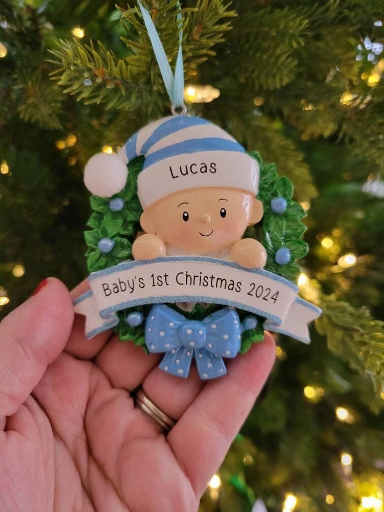 While the baby boy wreath blue personalized ornament cherishes early memories, don't miss the chance to commemorate the joy of the first Christmas with our blue baby's 1st Christmas snow baby personalized ornament. Your tree will be beautifully decorated with every significant moment.