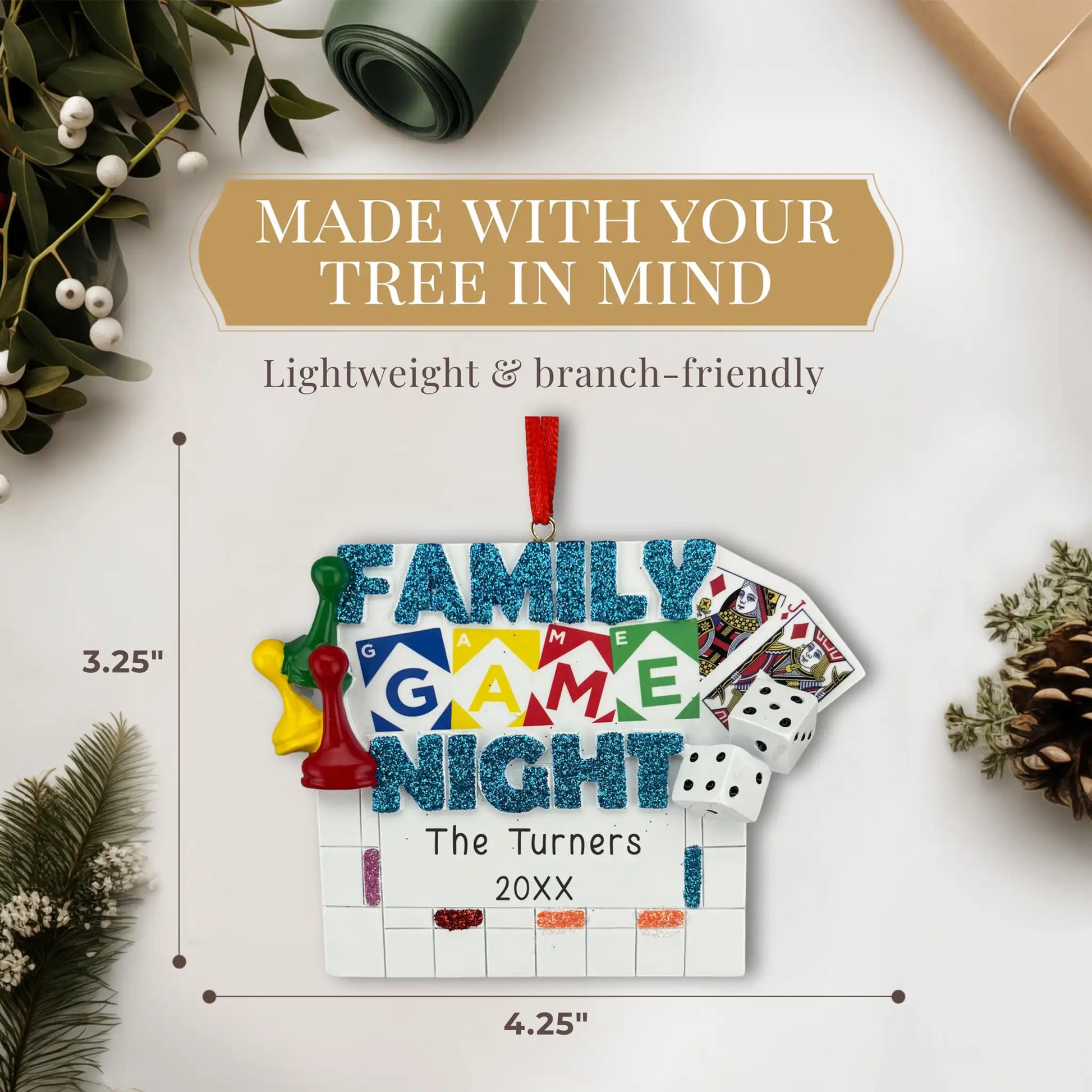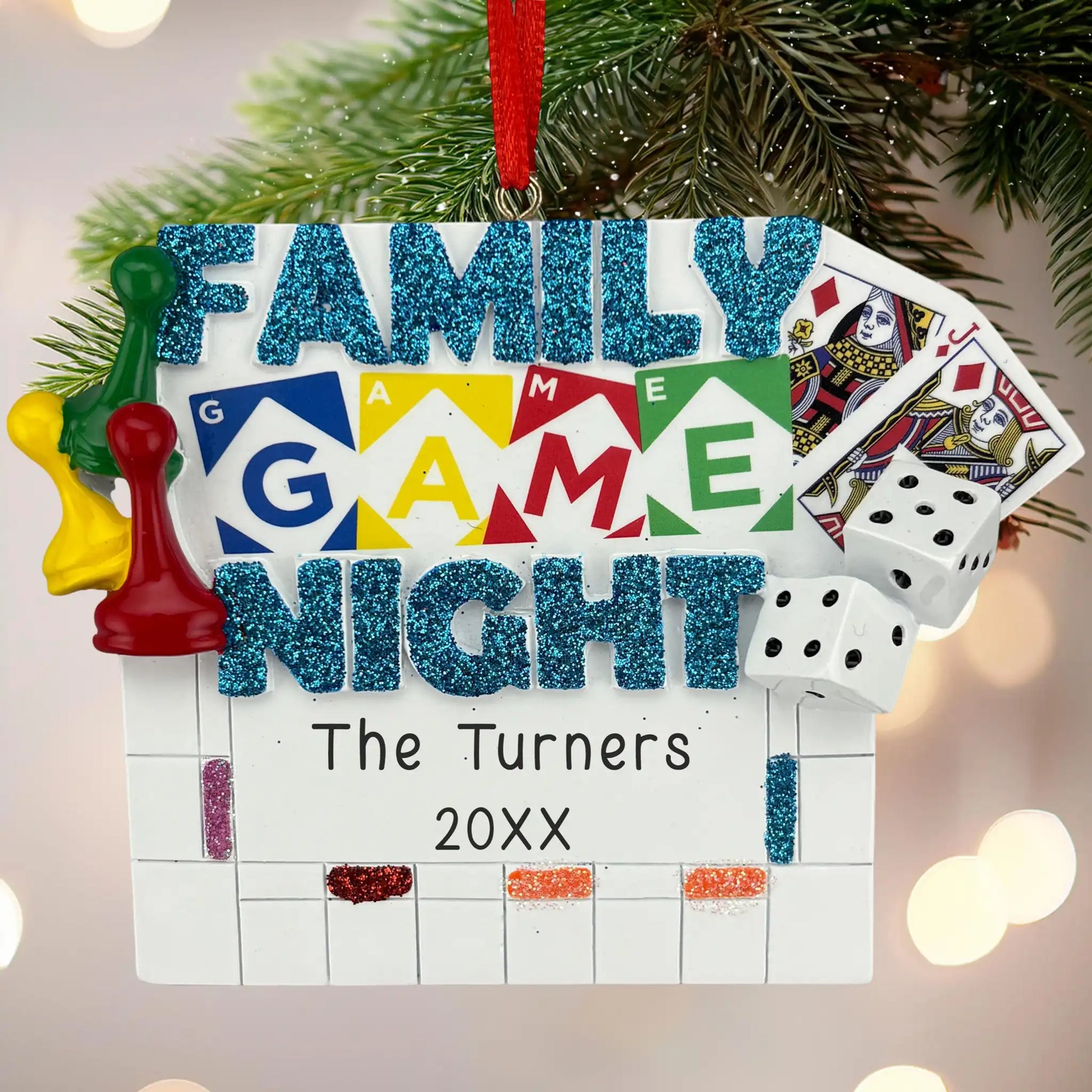 Celebrate the laughs, wins, and good-natured competition of game night with this personalized ornament featuring your family name and year.