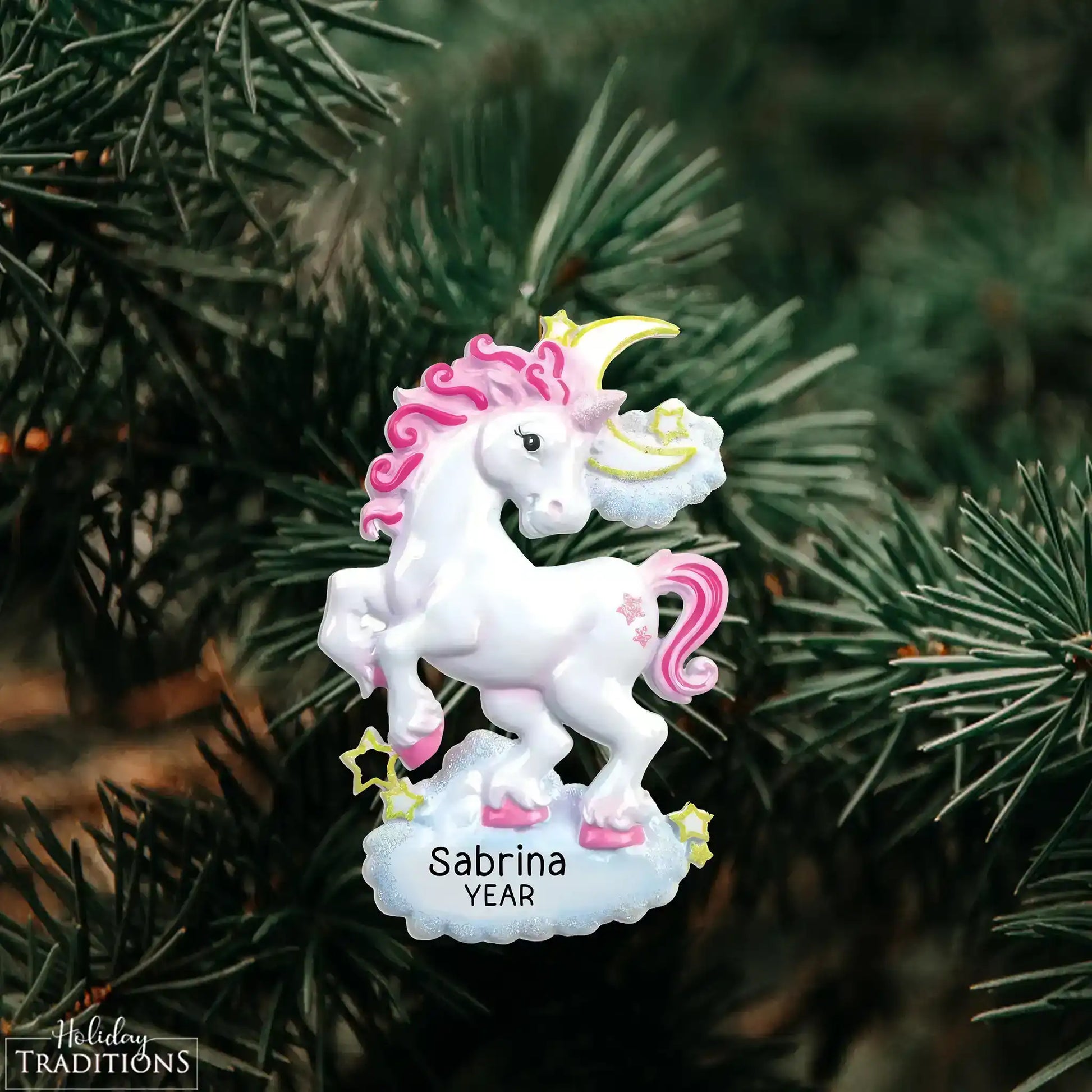 Bring the magic of unicorns to your Christmas tree with this beautifully personalized unicorn ornament. Delightfully detailed with shimmering glitter accents, vibrant colors, and charming cloud and star motifs, it's laser engraved to ensure your special girl feels truly unique. Crafted from durable resin, it's made to sparkle for years to come, and ships quickly so your thoughtful gift arrives right on time.