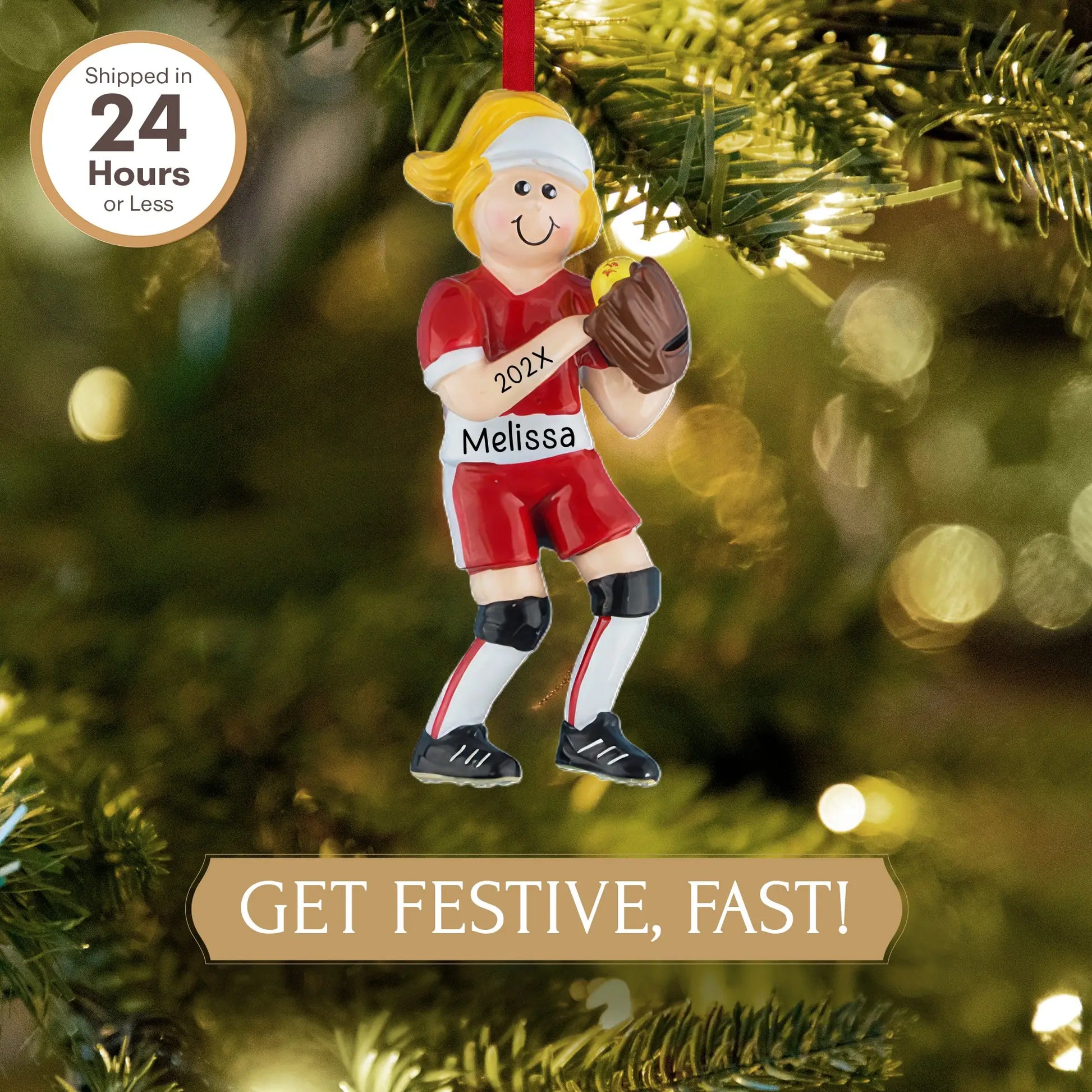 Blonde softball player in red and white uniform complete with tall socks, visor, softball, and glove! One of our many sports related ornaments perfect for kids involved in extracurricular athletics or even those training to become professional athletes! Take the time to customize with a name, jersey number, and year!
