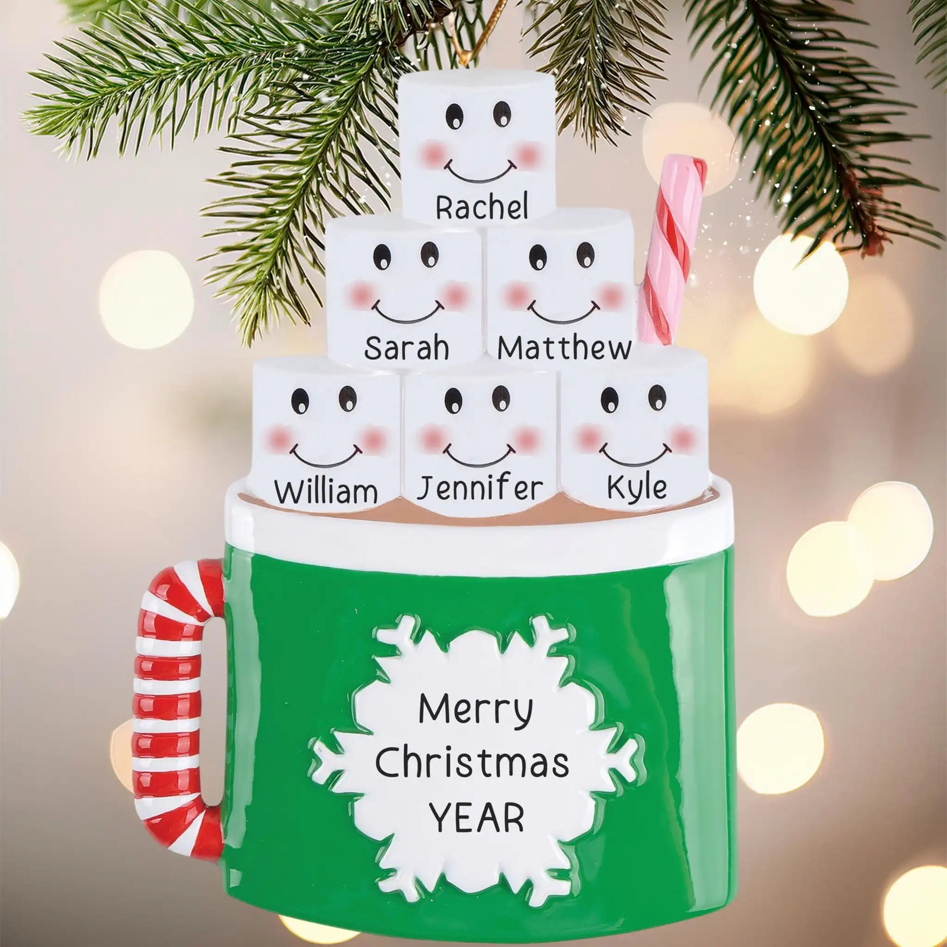 Bring everyone together with a cup full of Christmas cheer! This festive hot cocoa ornament features six smiling marshmallows peeking out of a green mug with a candy cane handle, personalized to celebrate your one-of-a-kind family.