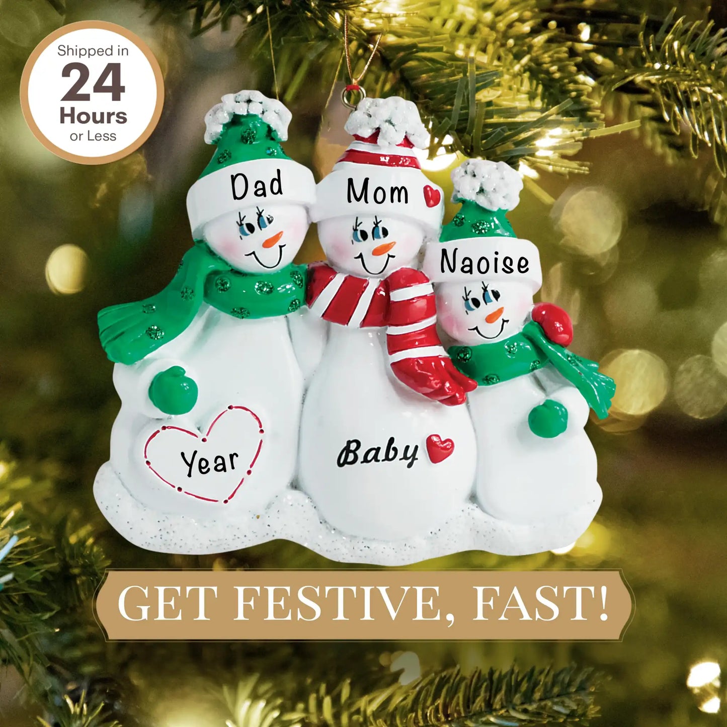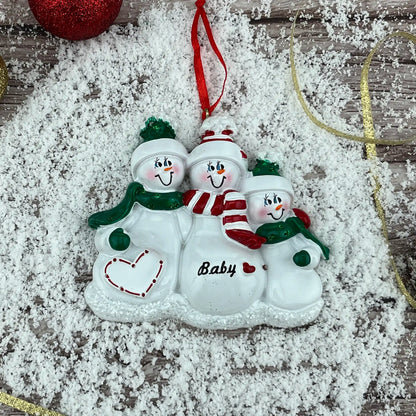 Let this ornament become a cherished part of your Christmas tree, symbolizing your growing family with bliss. The three snowmen represent each family member, with a new baby on the way. Personalize it with your names on the hat of each snowman and the year, all free of charge. It's more than an ornament; it's a personalized family of 3 decor and a precious keepsake.