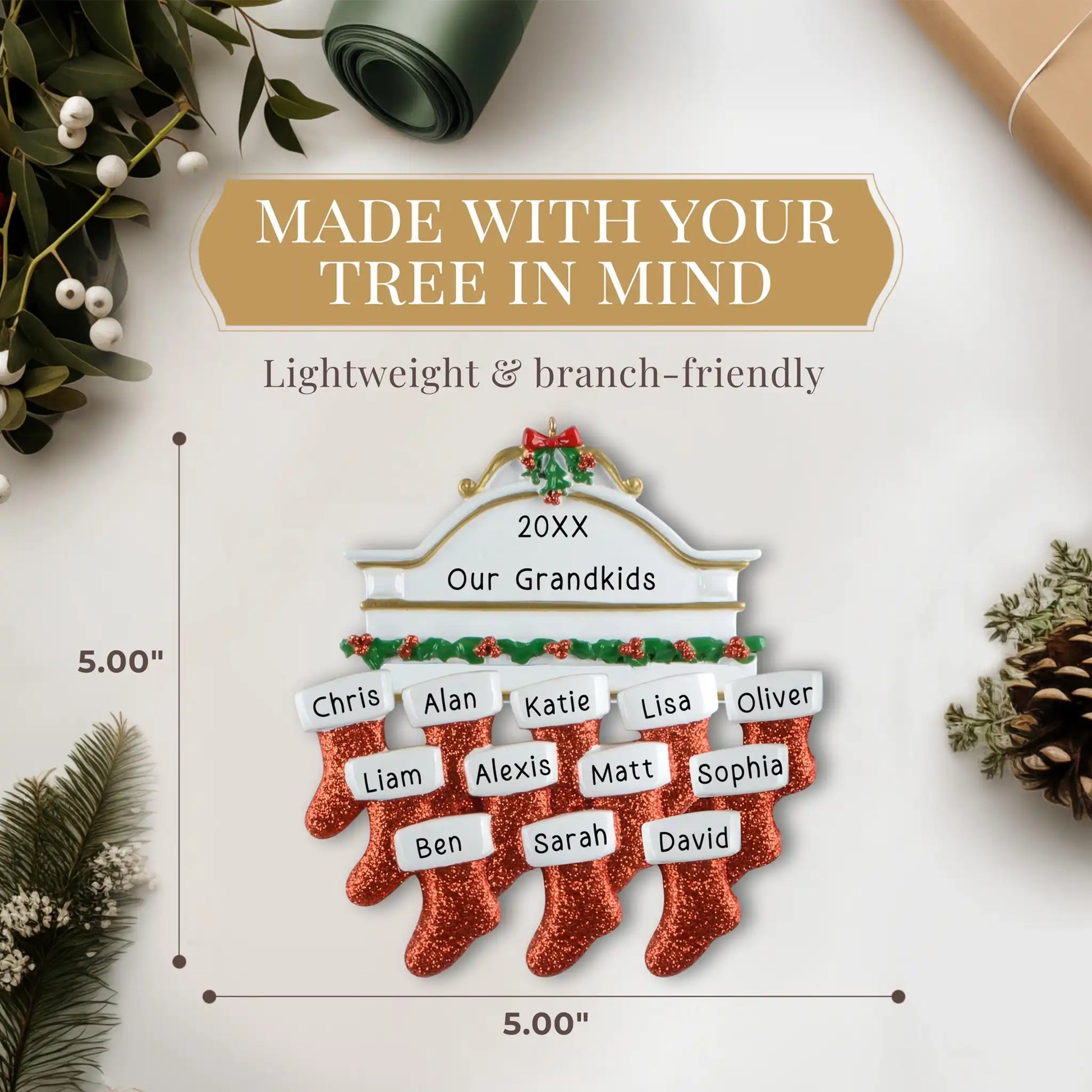 Celebrate the whole gang with this festive 12-name ornament! Each red glitter stocking holds a name, making it a joyful way to honor every grandkid, sibling, or cousin in the bunch.