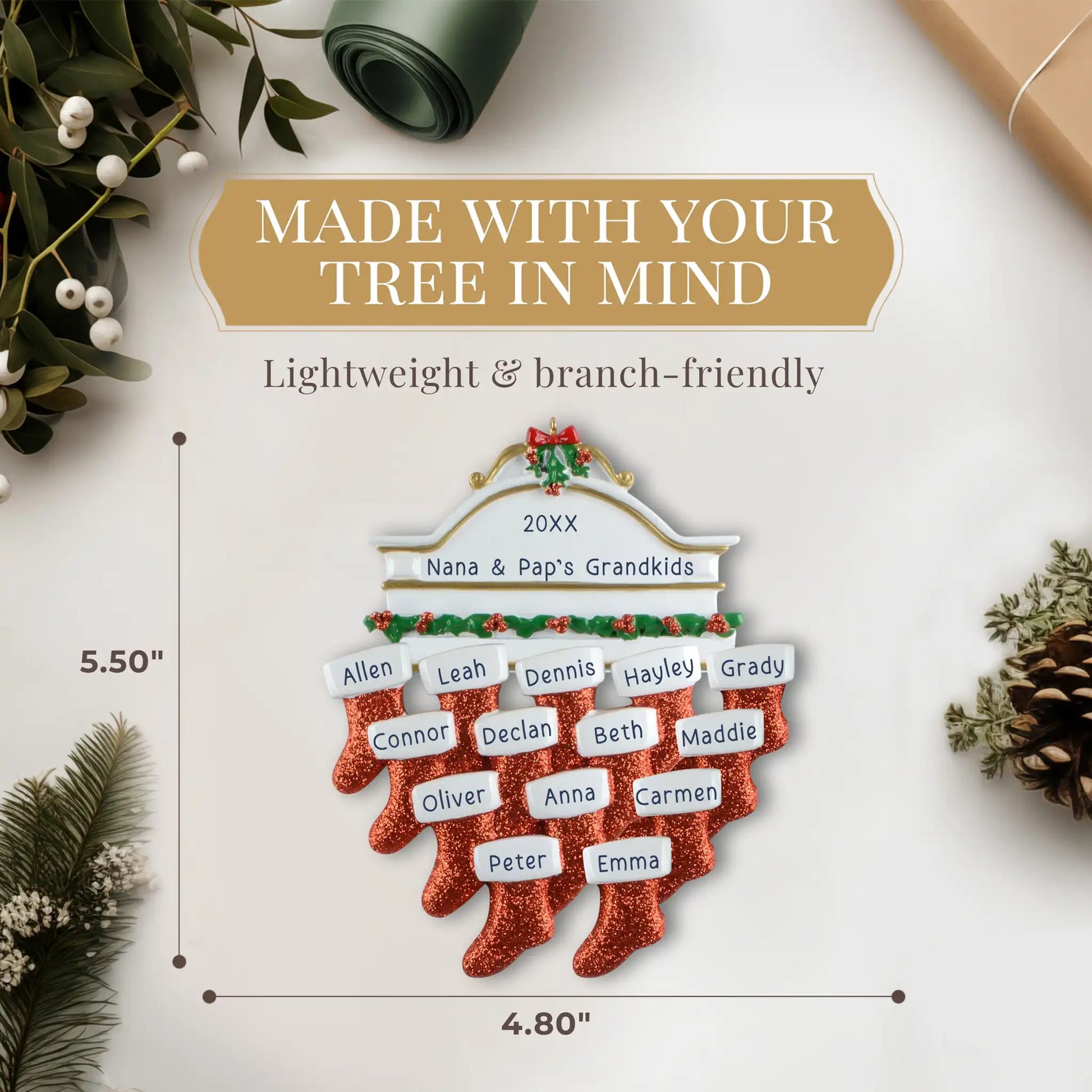 Showcase all the grandkids—or any loved ones—with this custom stocking ornament featuring up to 14 names. A festive and heartfelt family keepsake.