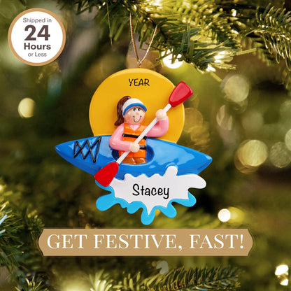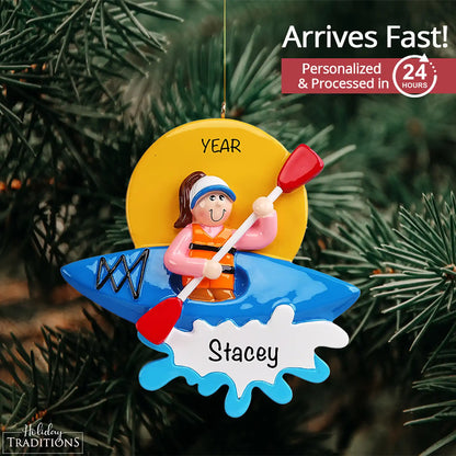 Adorable kayak girl Christmas ornament featuring a girl padding her kayak in the water. Personalize this unique kayaking gift with a name and year free!
