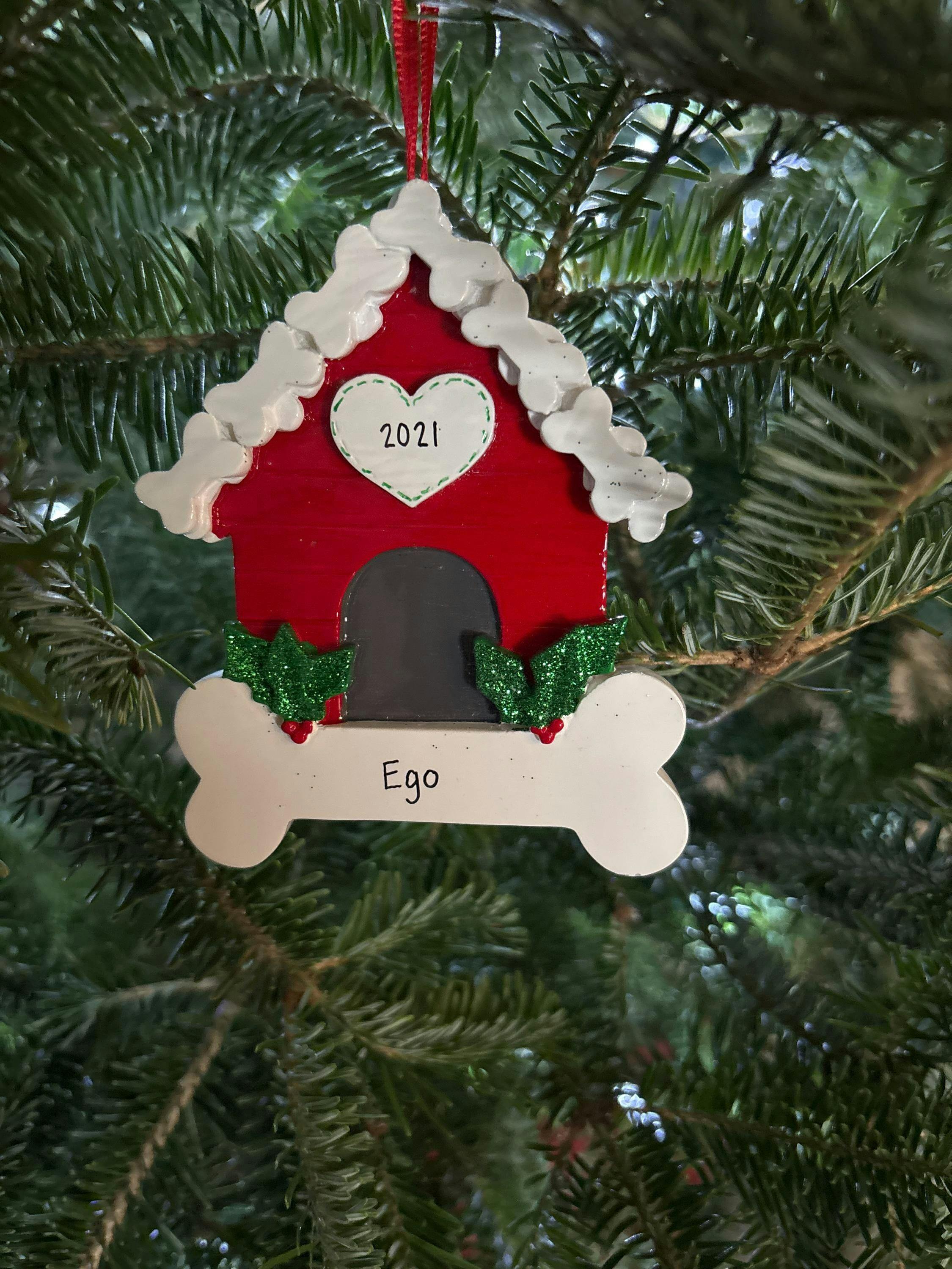 A snow covered dog house complete with dog bone base and holly leaves for decoration. An excellent way to give your puppy his own spot on the Christmas tree! Allow us to personalize it for you by adding your pet's name, some paw prints, and a year!