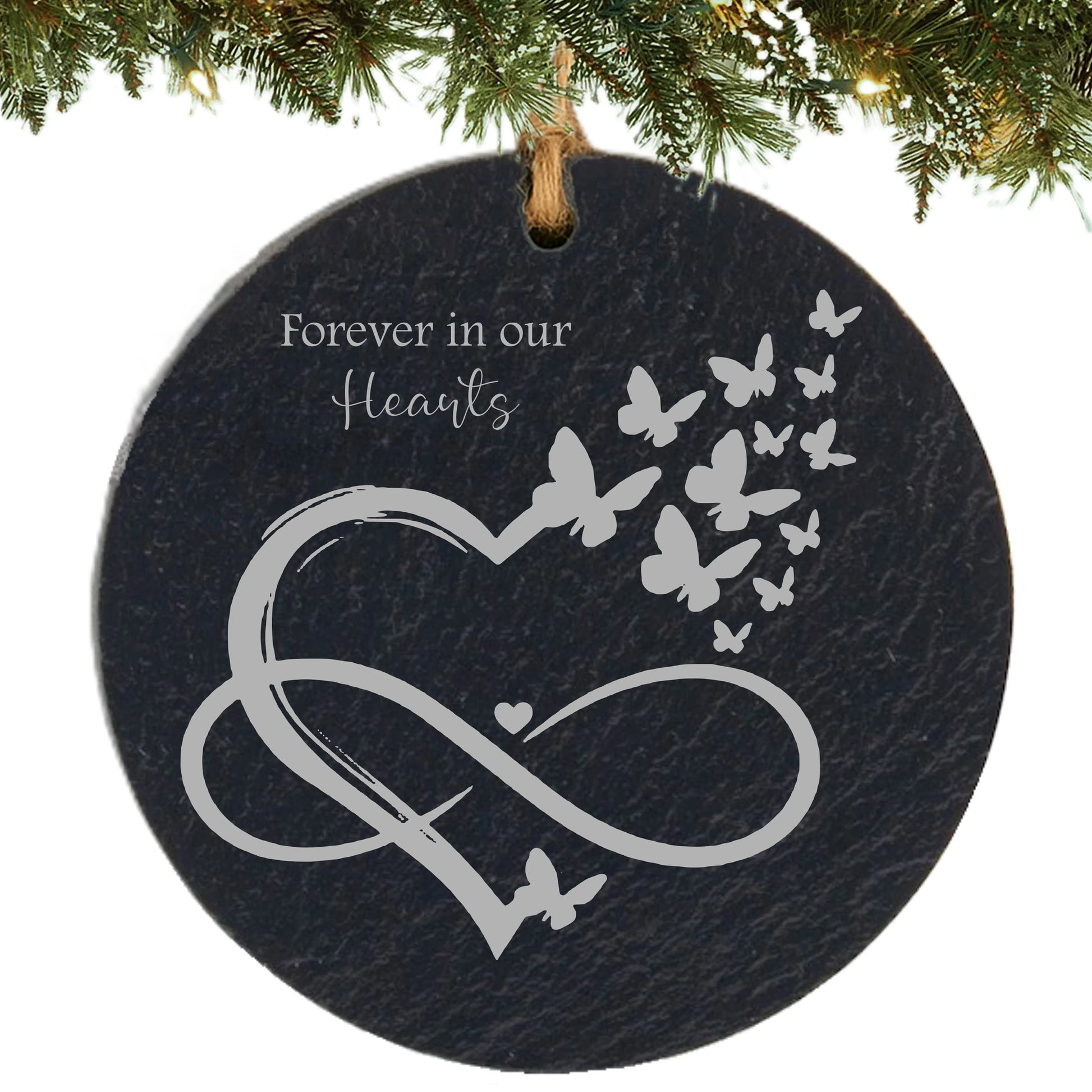 This round slate ornament features a beautifully engraved infinity heart design surrounded by butterflies, along with your loved one’s name and life dates. The phrase “Forever in our Hearts” adds a tender touch, creating a keepsake that brings comfort and remembrance year after year. The natural slate texture gives each ornament a timeless, meaningful feel, and every piece is laser engraved to order—shipping quickly so families can treasure it right when they need it most.