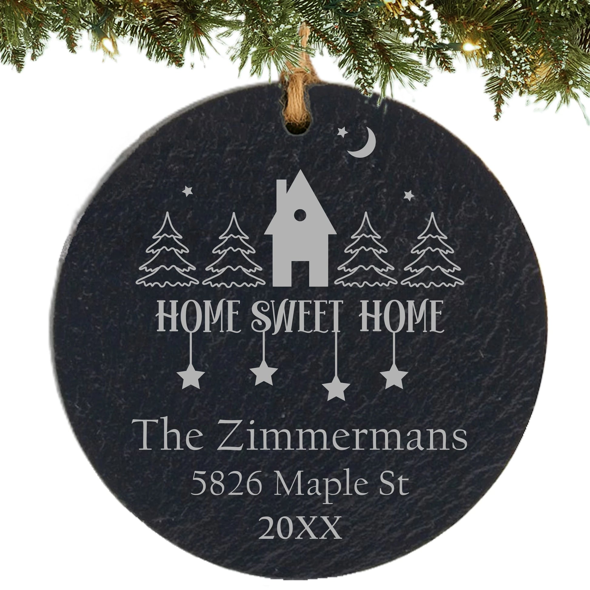 Crafted from premium beveled slate with a smooth, polished edge for maximum sparkle. Laser engraved with your family name, address, and year for a clean, lasting finish. Includes a silver hanging cord for easy display on any Christmas tree or ornament stand.