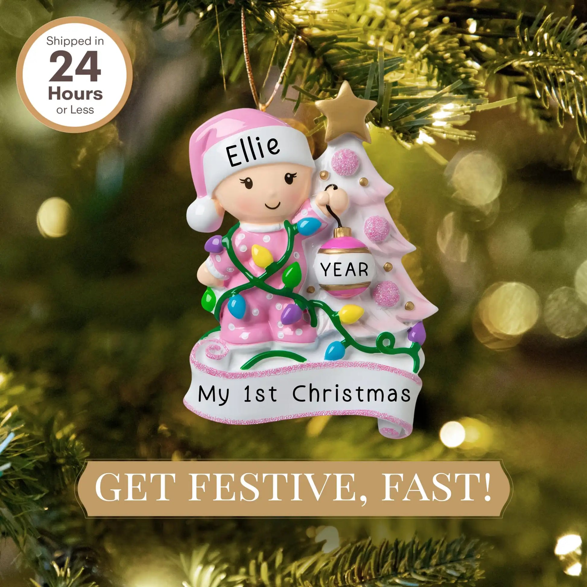 La adorable bebé, envuelta en coloridas luces navideñas, se encuentra junto a un árbol rosa bellamente decorado. El banderín inferior se puede personalizar con un nombre, el año o un mensaje especial, ¡lo que lo convierte en el recuerdo perfecto para cualquier ocasión!