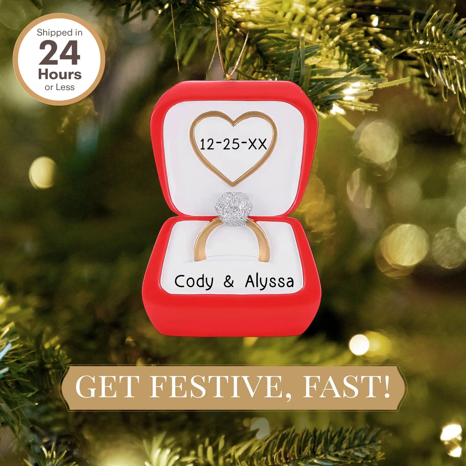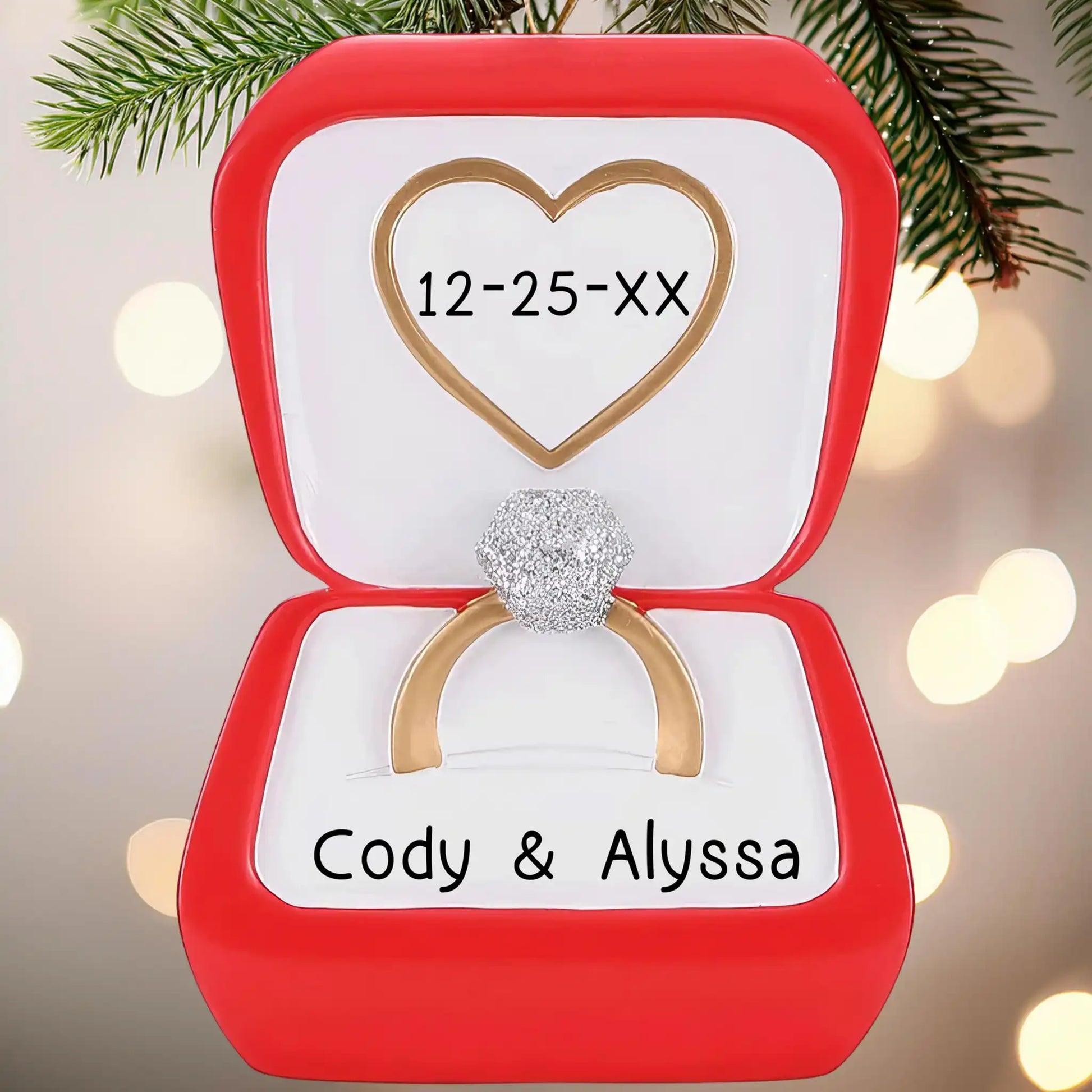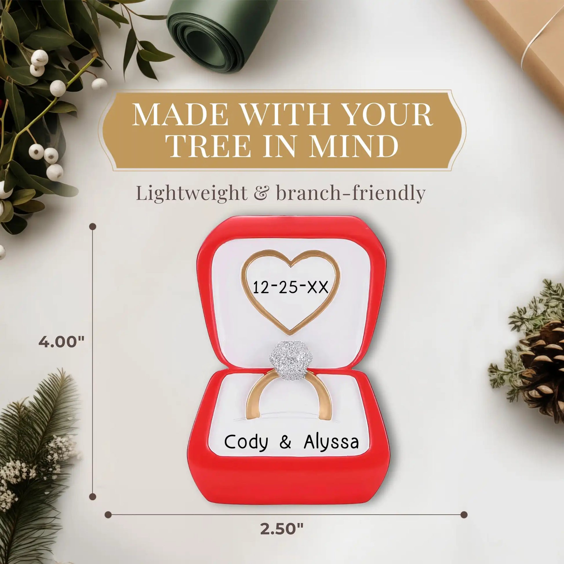 Celebra uno de los momentos más inolvidables de tu vida con este impresionante adorno de anillo de compromiso personalizado. Diseñado para capturar la alegría de la gran pregunta, este adorno presenta un anillo brillante dentro de un joyero rojo brillante.