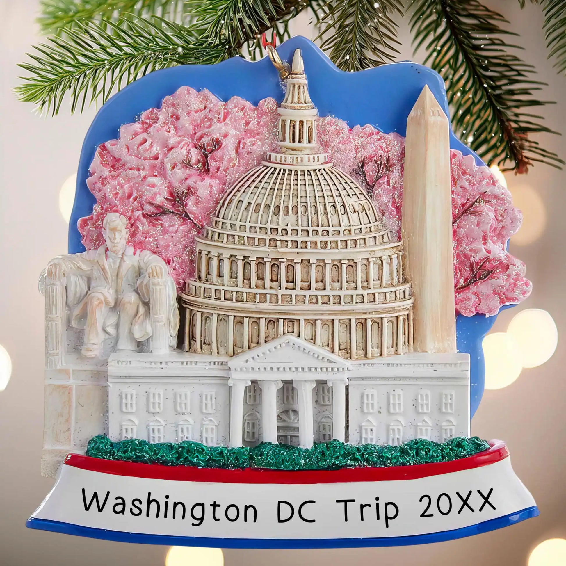 ¡Conmemora un viaje a la capital de EE. UU.! Este adorno navideño personalizado con temática de Washington D. C. incluye todos los monumentos famosos. Añade un nombre y el año.