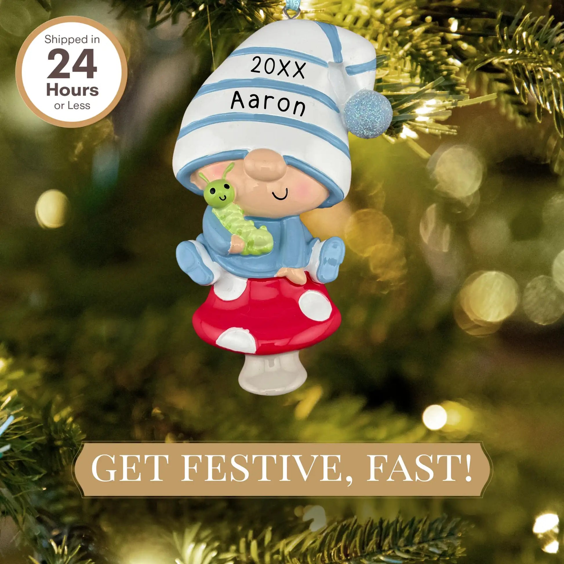 Desde el enorme gorro de rayas hasta la alegre oruga, este gnomo bebé se caracteriza por sus detalles divertidos. Sentado sobre un hongo rojo con lunares y detalles pastel, es adorable, acogedor y perfecto para celebrar un año importante. Personalízalo con su nombre y el año para que sea un dulce recuerdo que guardarás por años. Cada adorno está grabado a láser para una calidad duradera y se envía en 24 horas o menos, porque los recuerdos deben ser fáciles y mágicos.