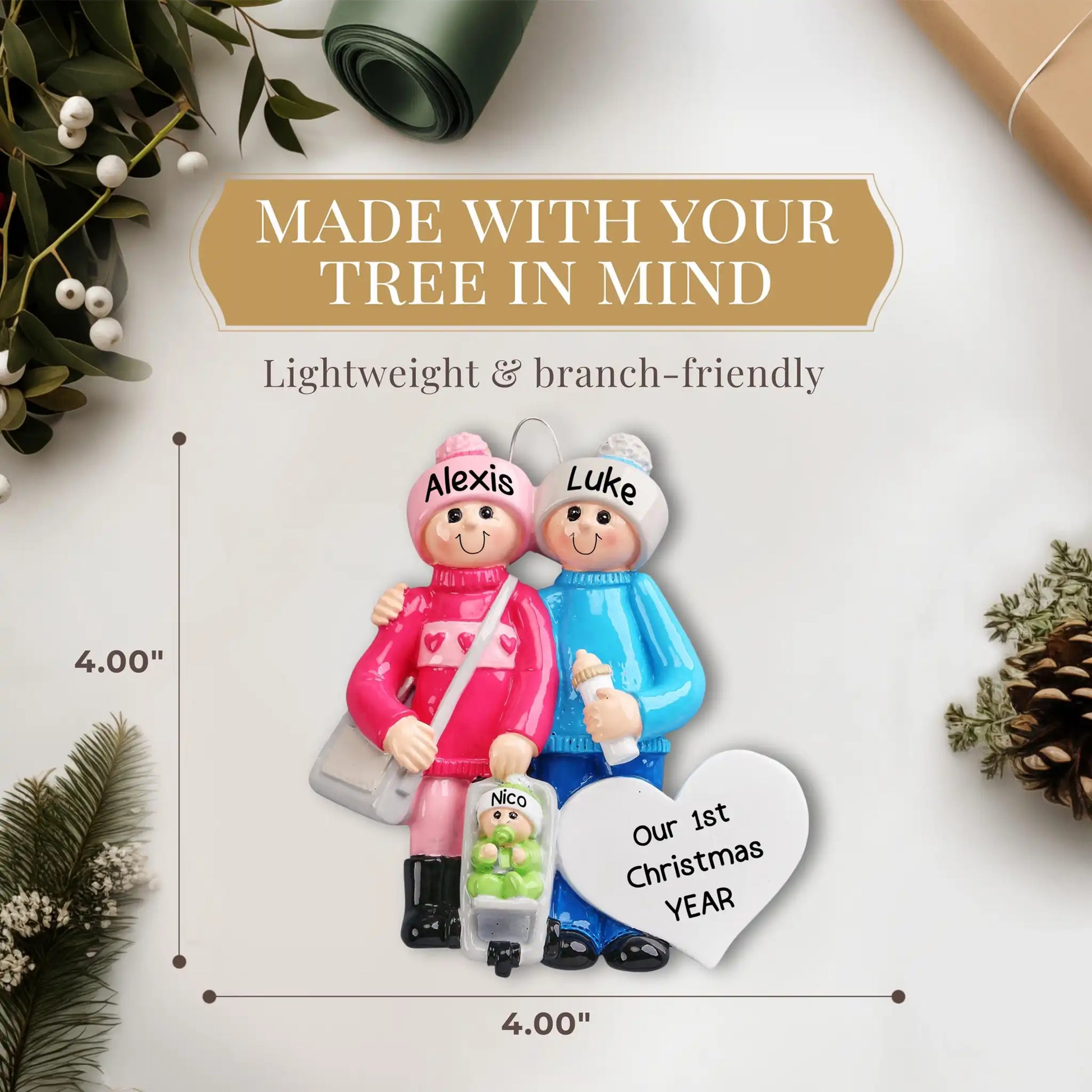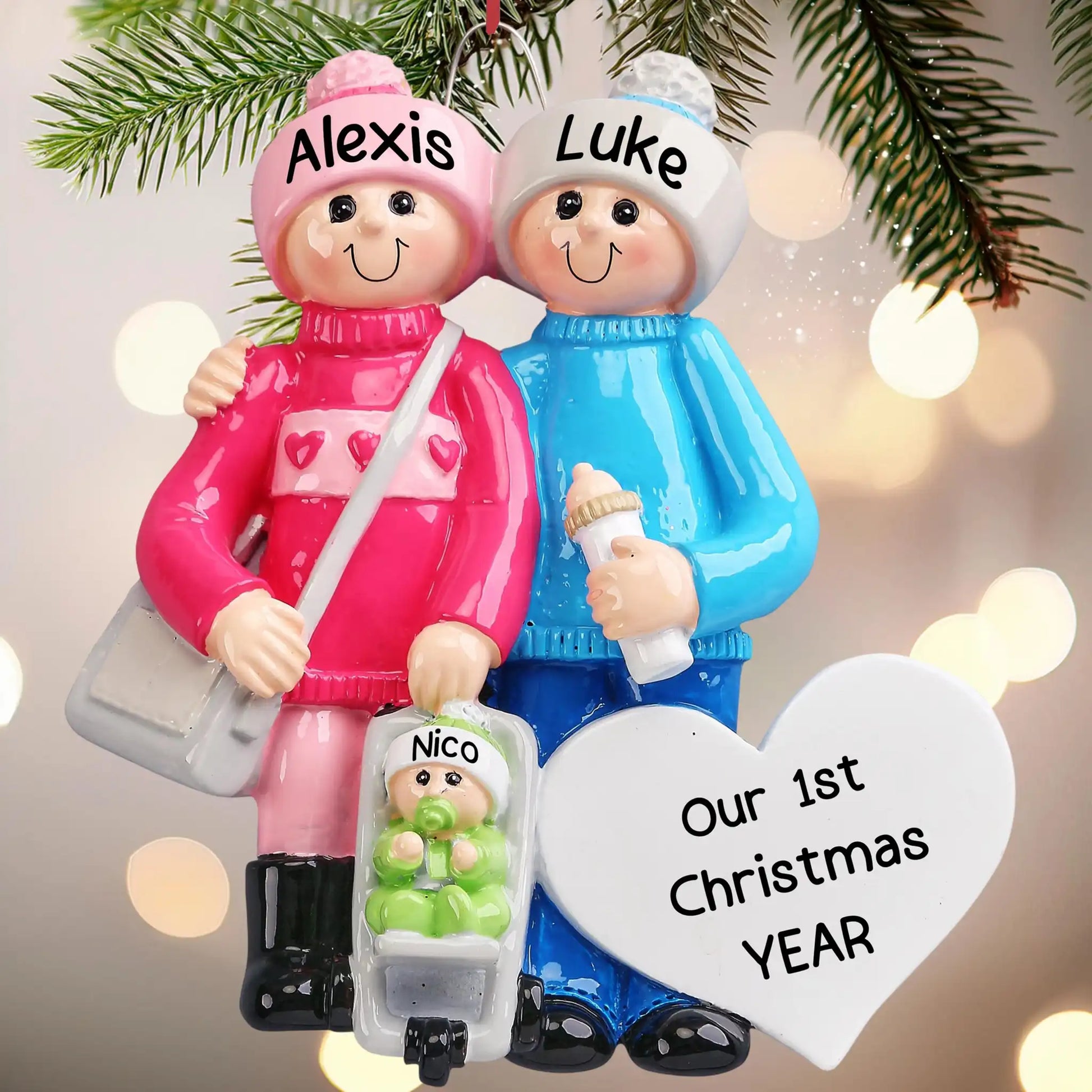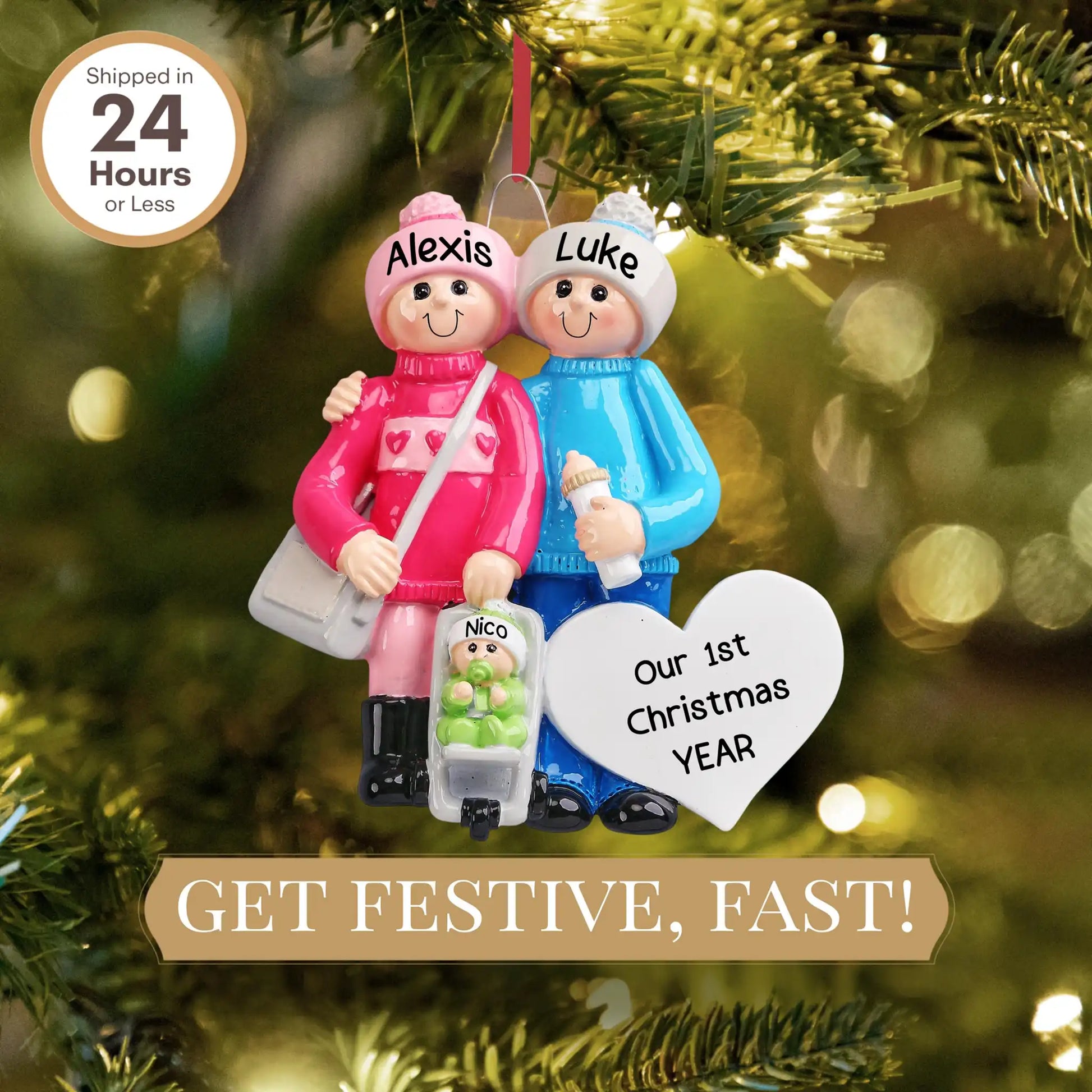 Adorable adorno familiar personalizado con mamá, papá y el bebé recién nacido. Un regalo ideal para la primera Navidad de una familia recién nacida.
