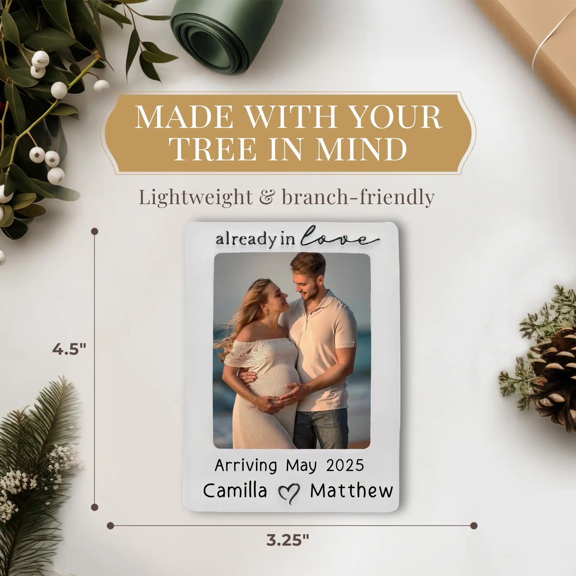 Ideal como un regalo considerado para futuros abuelos, amigos o familiares que buscan colmar de amor a la feliz pareja, este adorno es más que una simple decoración: es un recuerdo sincero que les recordará este emocionante viaje.