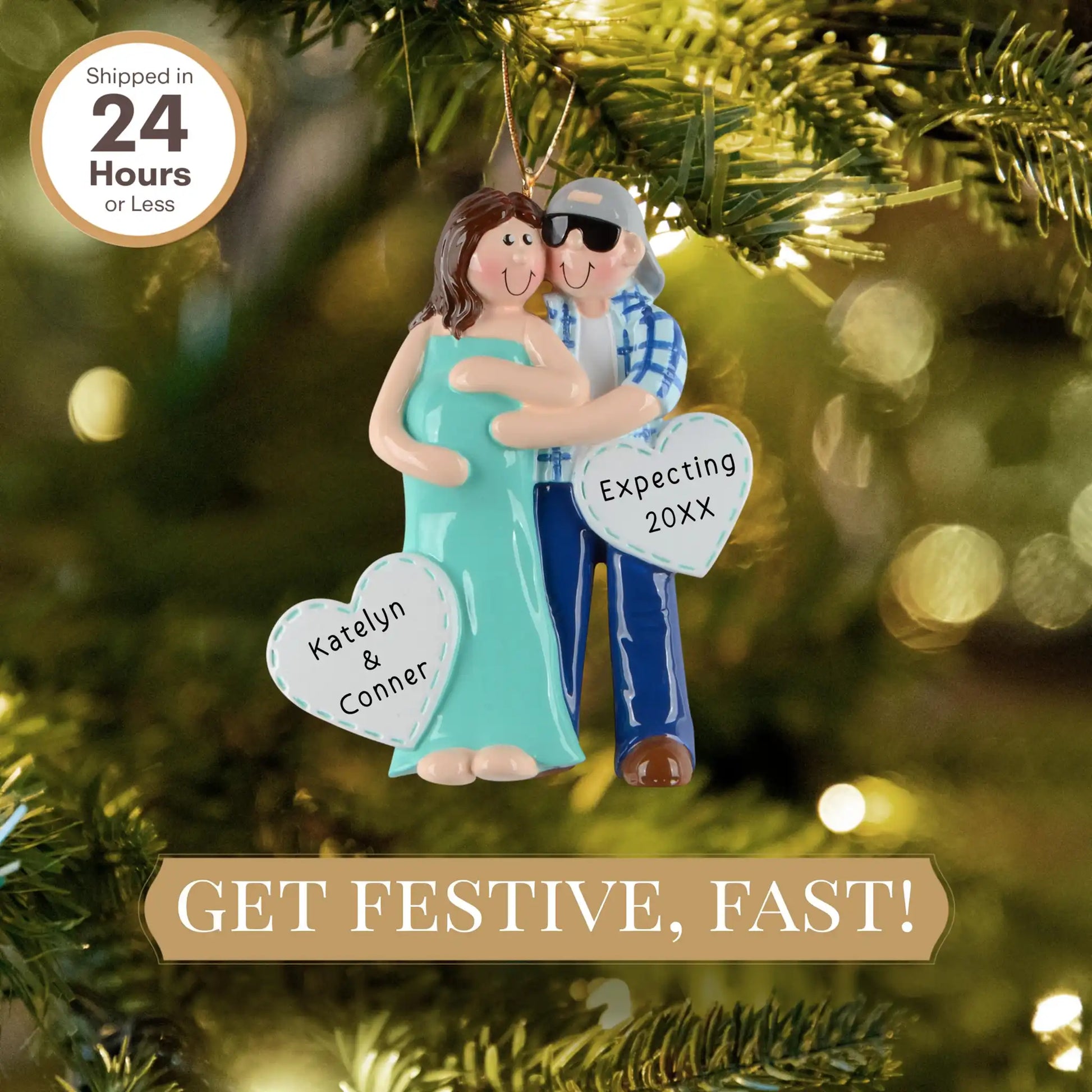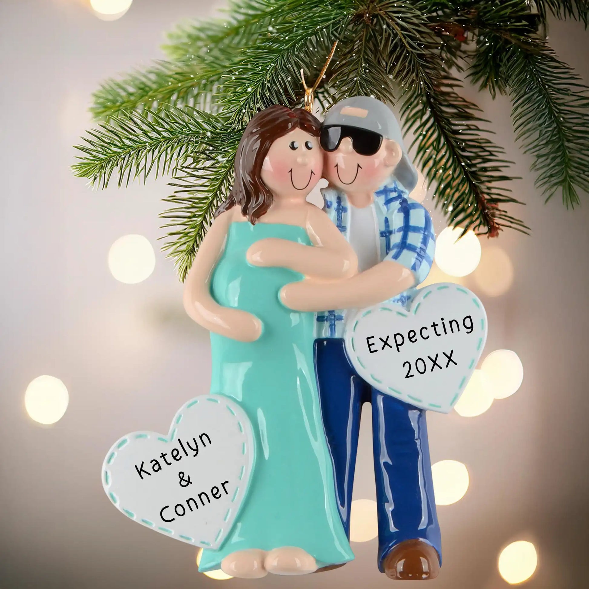 ¡Una gran noticia merece un dulce recuerdo! Nuestro adorno personalizado "Pareja Embarazada" es una forma conmovedora de recordar el año en que sus vidas cambiaron para siempre. Con una pareja sonriente abrazando con cariño la barriguita, este adorno captura la ilusión y la alegría de esperar la llegada de tu pequeño.