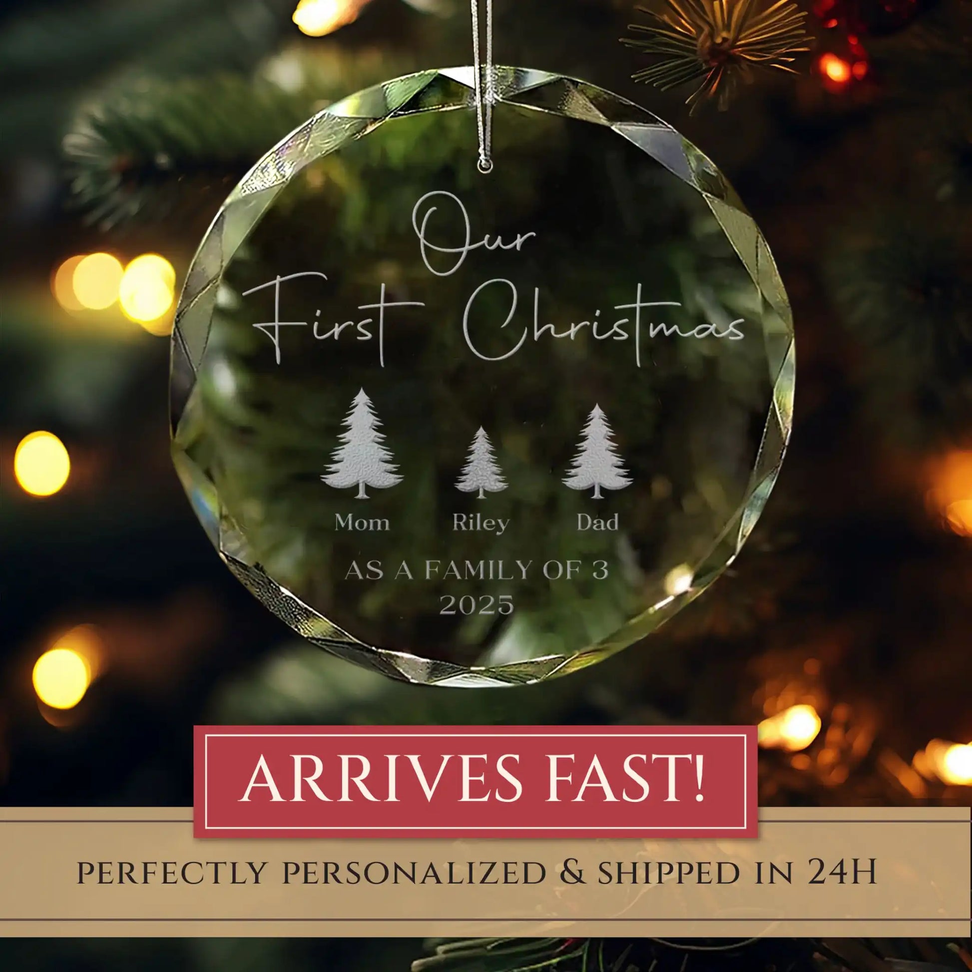Celebrate your very first Christmas together as a family with this beautifully engraved glass ornament — a heartfelt keepsake that captures the joy of new beginnings.