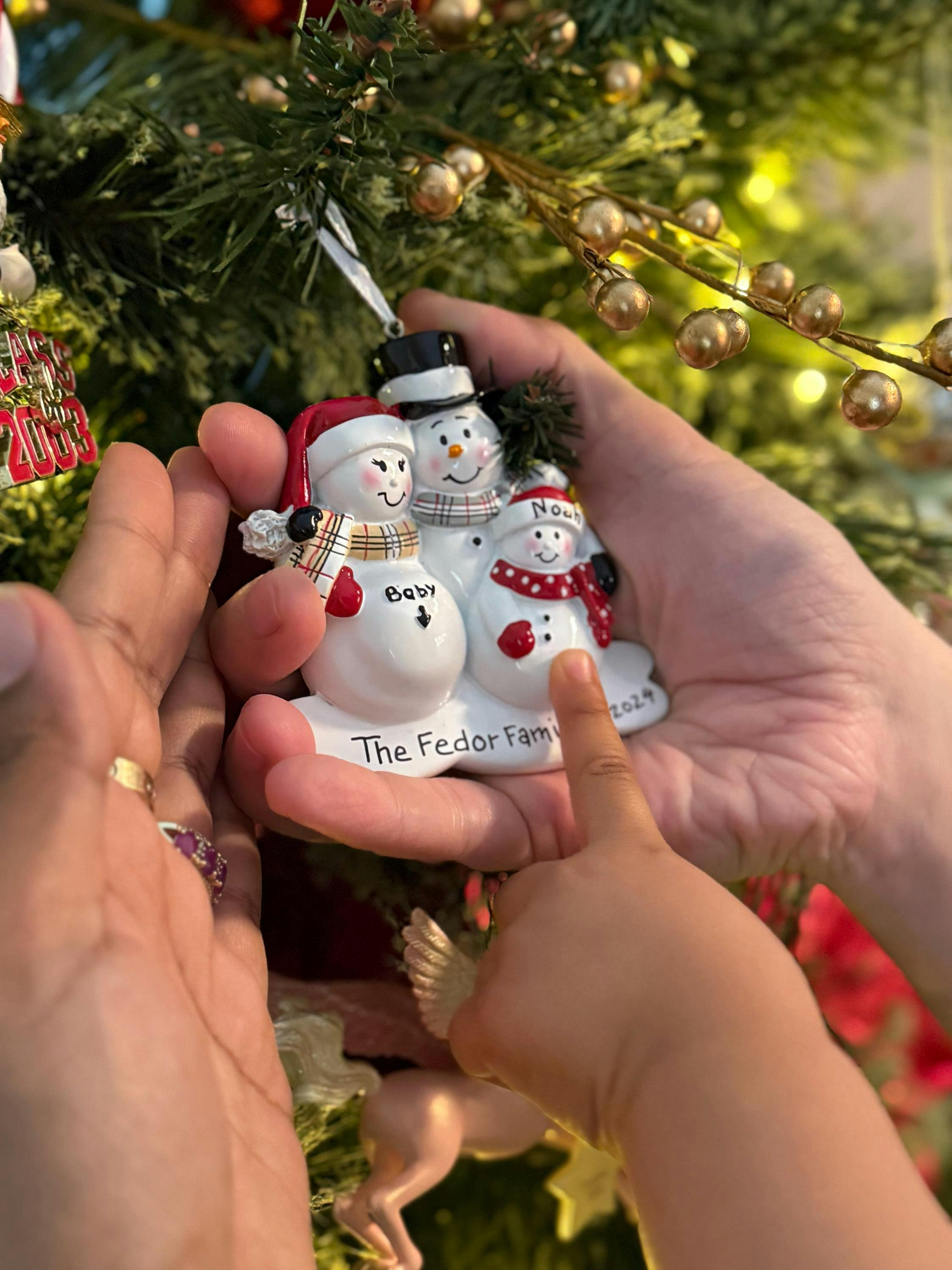 Dale un toque de alegría a tu árbol con nuestro Adorno Personalizado de Muñeco de Nieve Familia de 3 Futuras Nacimientos. Con una encantadora familia de muñecos de nieve y un nuevo bebé en camino, este adorno captura toda la emoción de dar la bienvenida a un bebé durante las fiestas. Mamá, papá y el bebé que está por llegar lucen cálidas bufandas y atuendos festivos. Personalízalo con los nombres de tu familia y el año para crear un recuerdo que celebre este momento inolvidable. ¡Es el regalo perfecto para los futuros padres o una maravillosa adición a tu árbol de Navidad!
