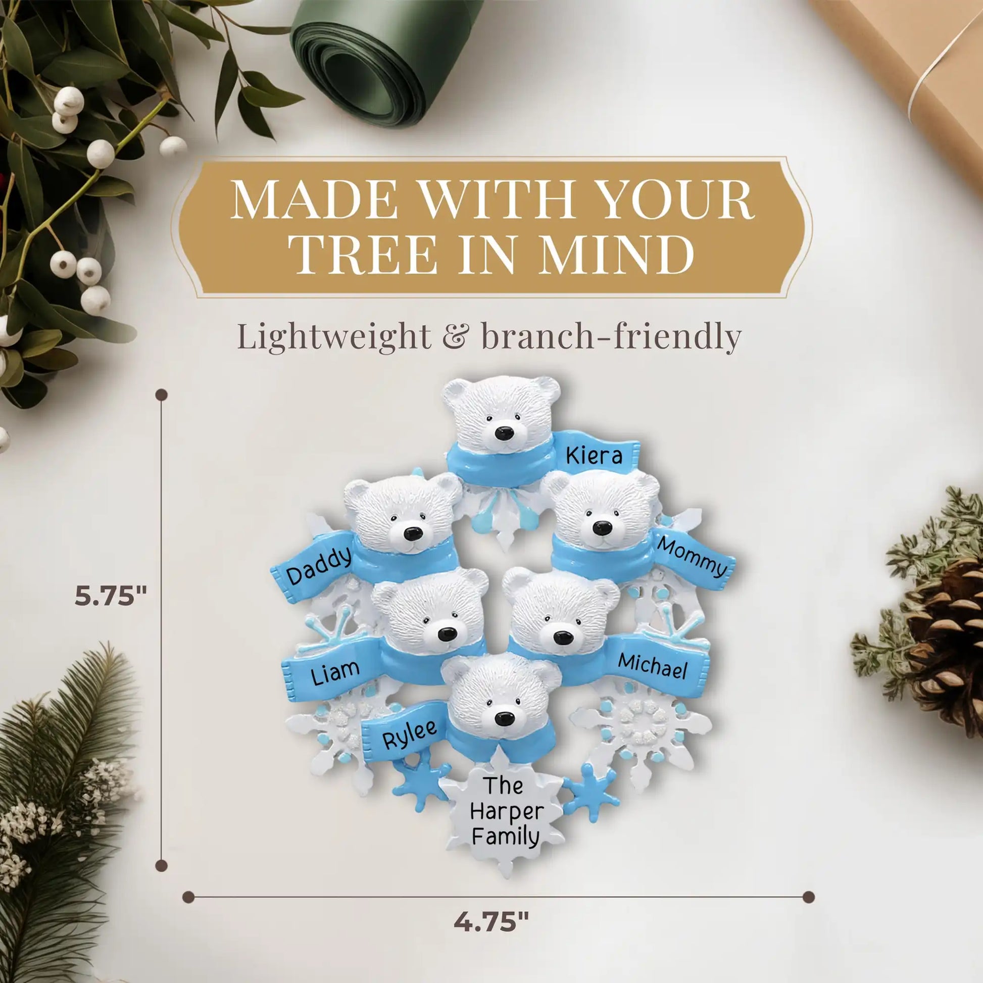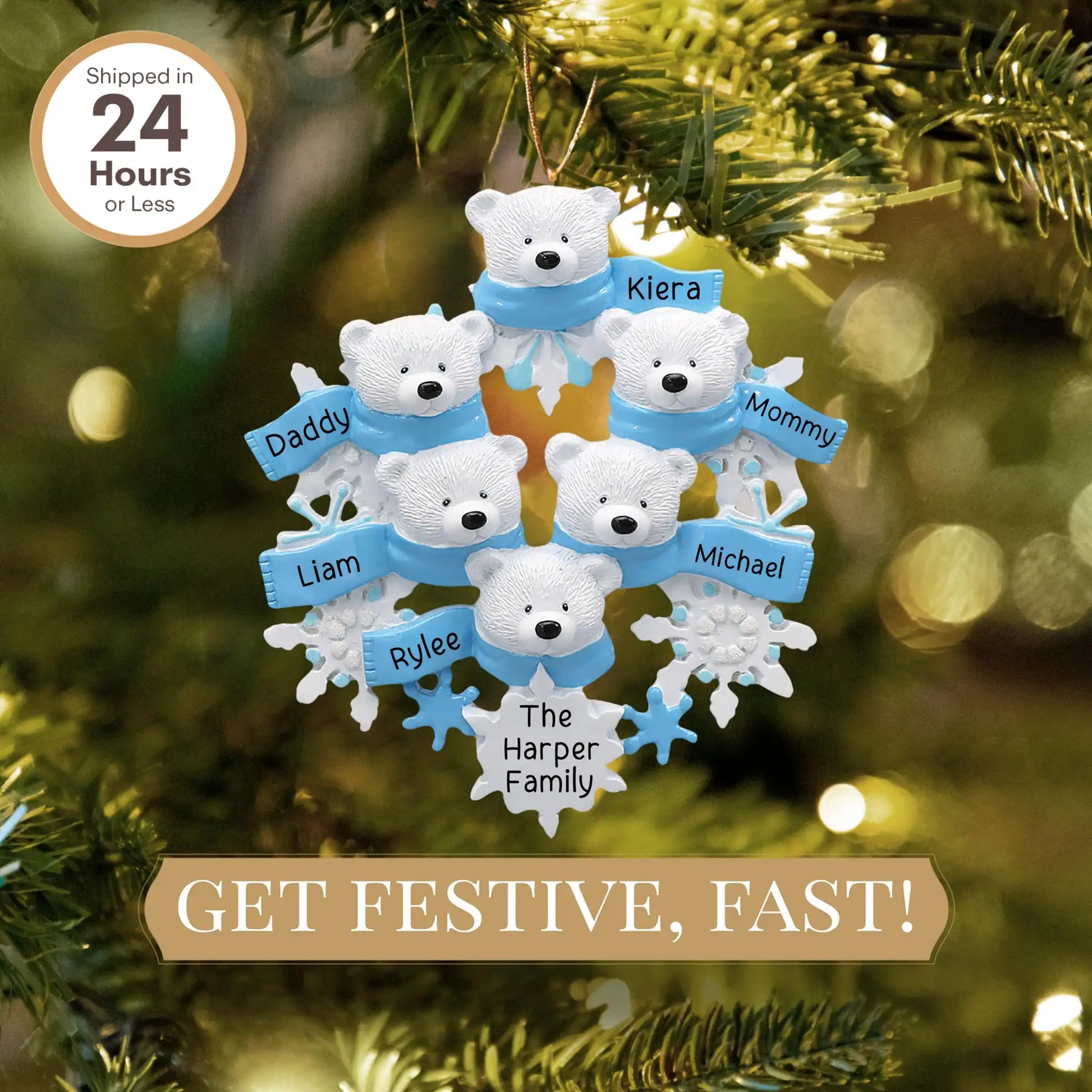 El aire frío y gélido, y los copos de nieve azules y blancos, con hermosos detalles, que caen alrededor de seis osos polares, sugieren un día de invierno perfecto. El copo de nieve central no tiene textura y nuestros artistas pueden personalizarlo con un mensaje breve. Las acogedoras bufandas azules son el lugar perfecto para añadir nombres. No hay distinción de género, ¡así que es un regalo ideal para todos!