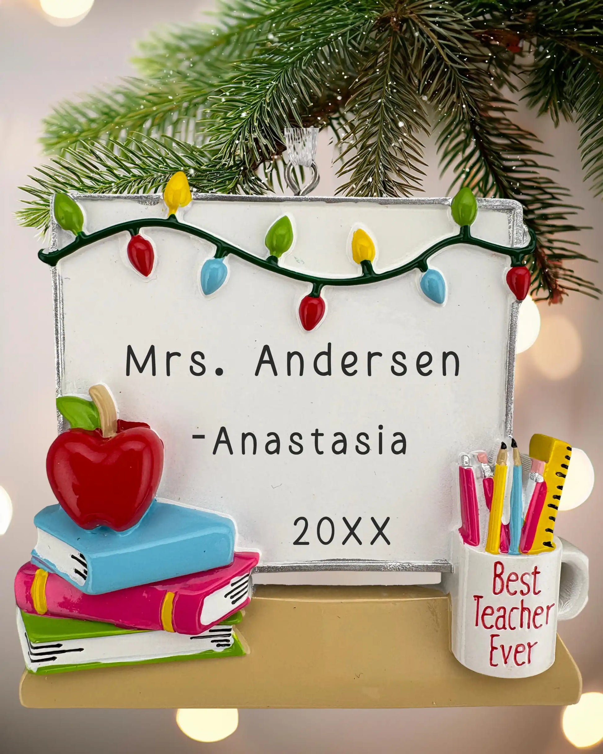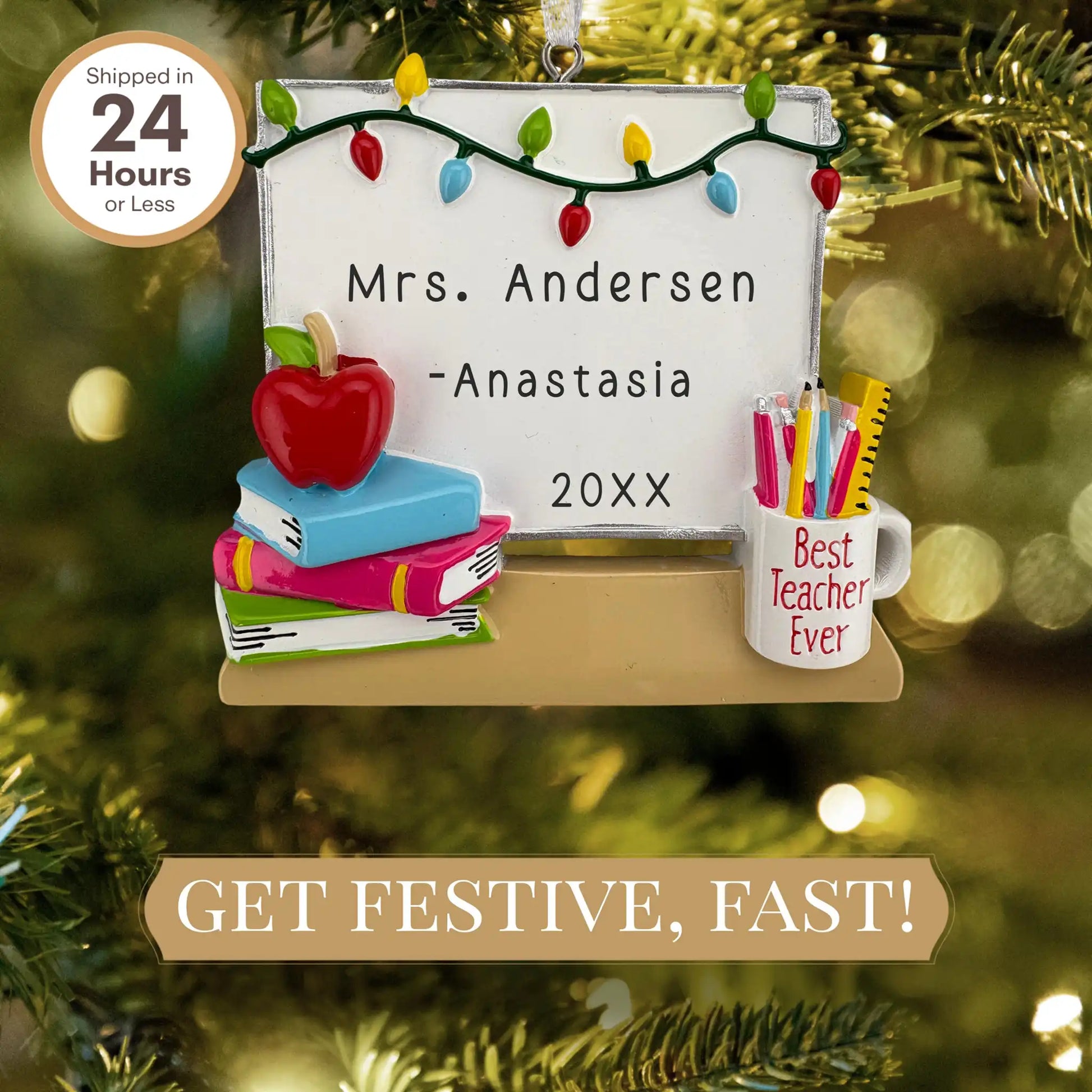 Celebrate your child's educator with a keepsake that’s as memorable as their impact. This personalized teacher ornament features a bright classroom whiteboard trimmed with holiday lights, a red apple, a stack of books, and a mug that reads “Best Teacher Ever.” It’s a charming way to thank a teacher at Christmas or the end of the school year. Each ornament is laser engraved for lasting quality and ships within 24 hours—so you can check teacher gifts off your list early.