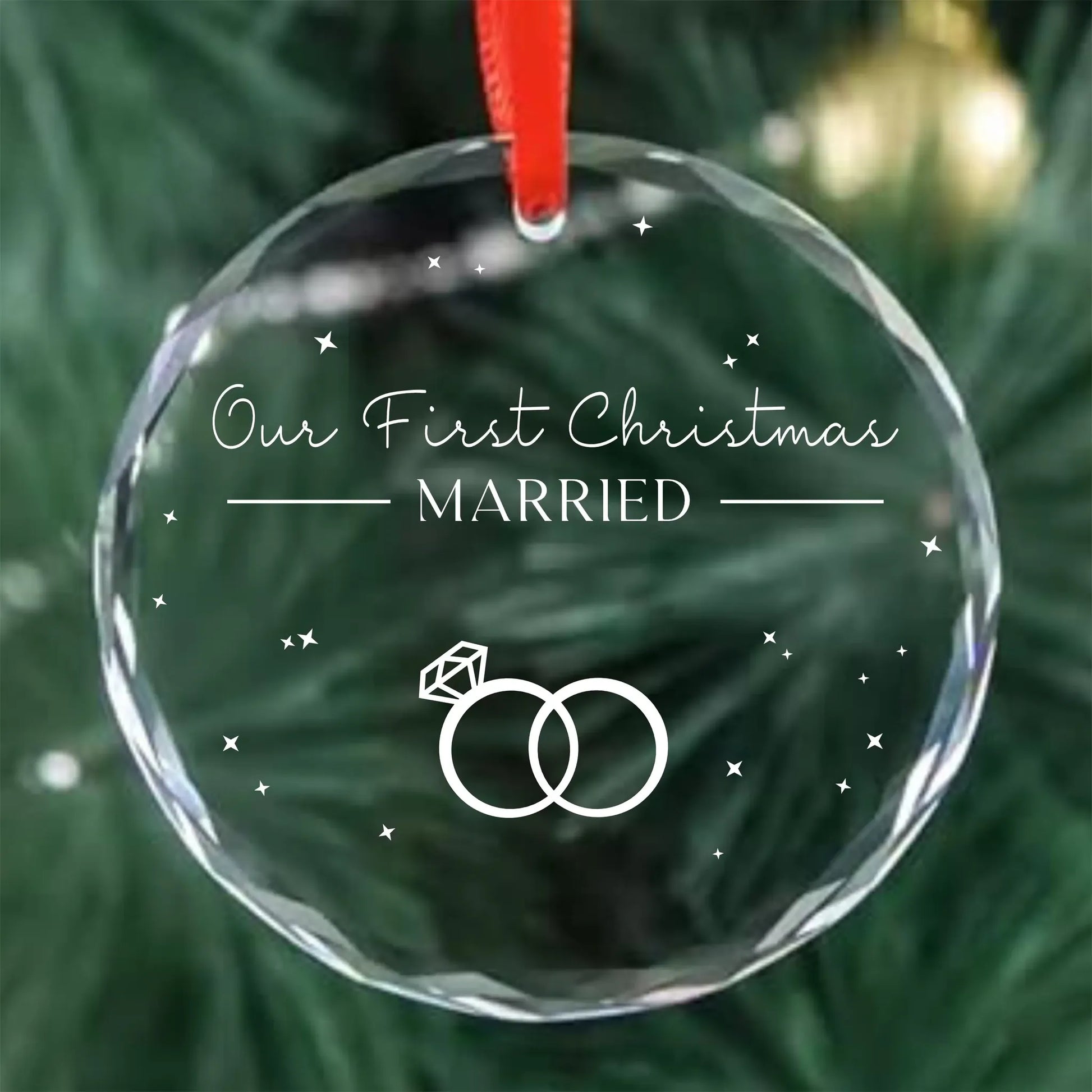 Crafted from premium crystal with a smooth beveled edge and silver hanging cord. Each ornament is laser engraved with your custom names, “Our First Christmas Married,” and the year — creating a timeless keepsake that sparkles beautifully under the lights.
