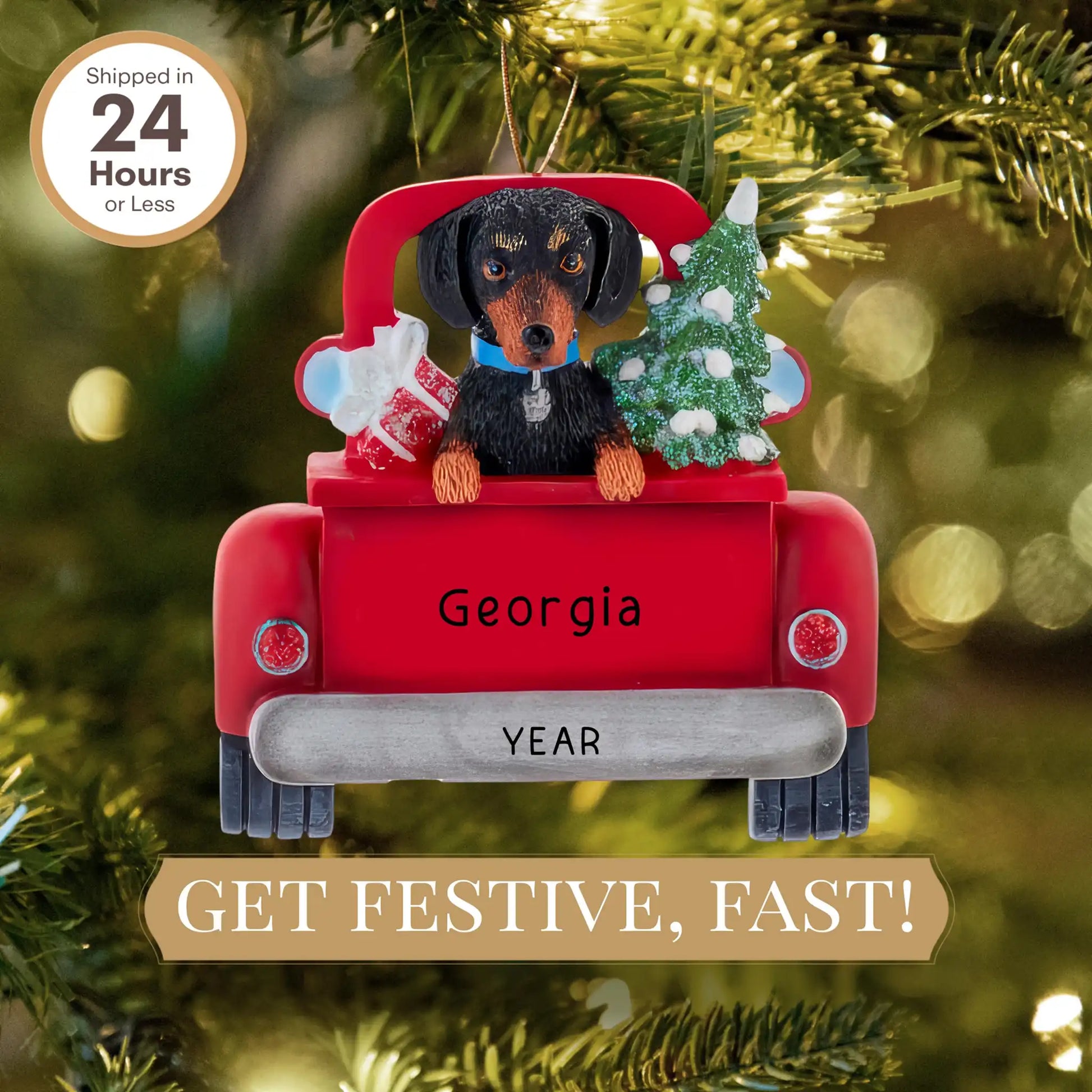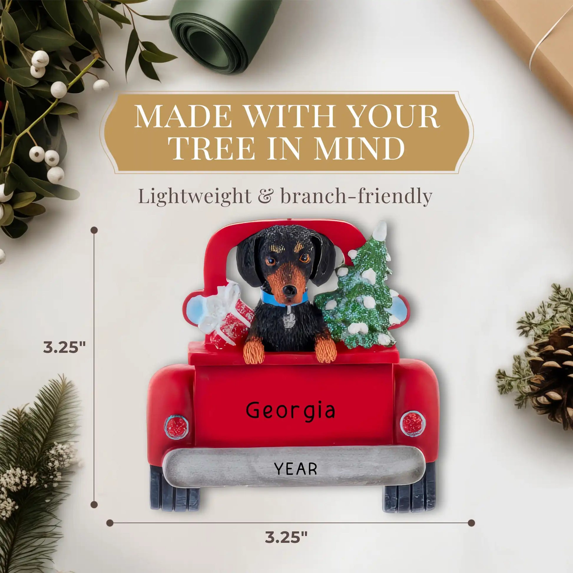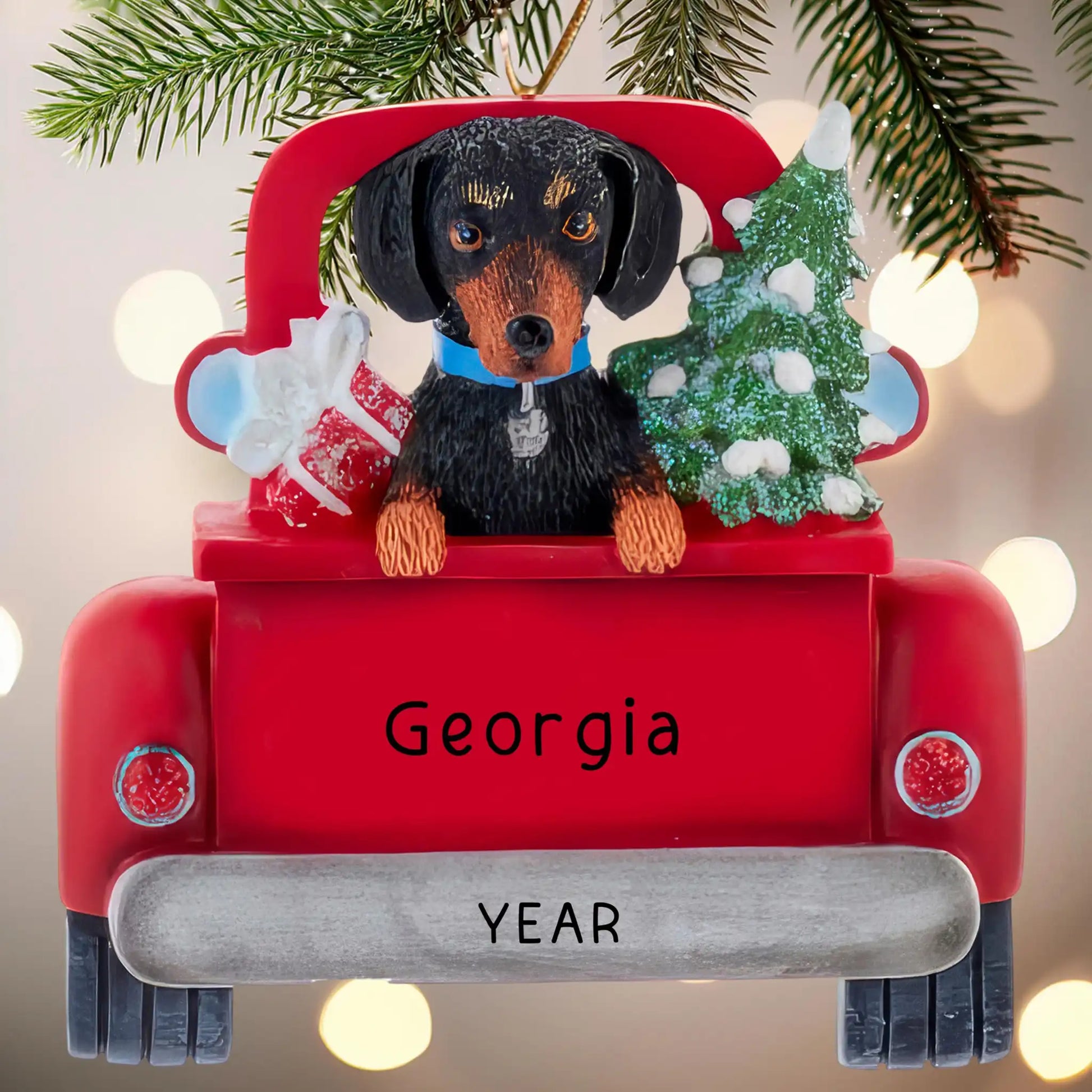 Dale un toque festivo a tu árbol con nuestro adorno navideño personalizado de perro salchicha negro. Este encantador adorno presenta a un adorable perro salchicha negro en la parte trasera de una camioneta roja vintage, capturando la alegría de las fiestas. Personalízalo con un nombre y el año para crear un recuerdo único o un regalo especial para dueños de perros salchicha y amantes de los perros. ¡Imprescindible para quienes aman la decoración navideña vintage con un toque divertido!
