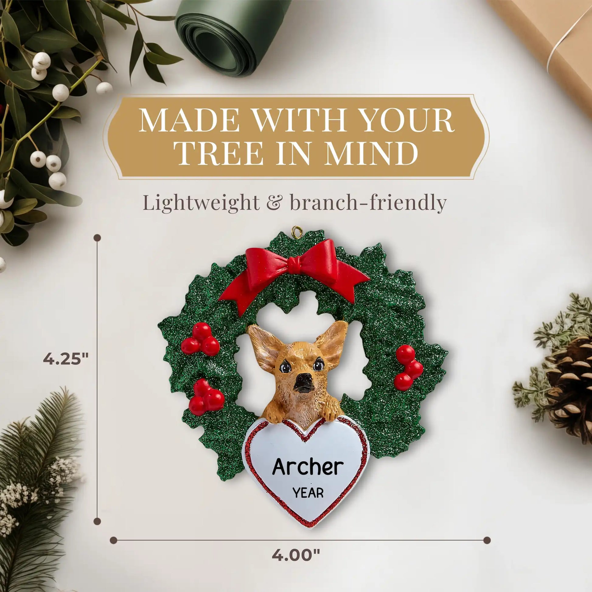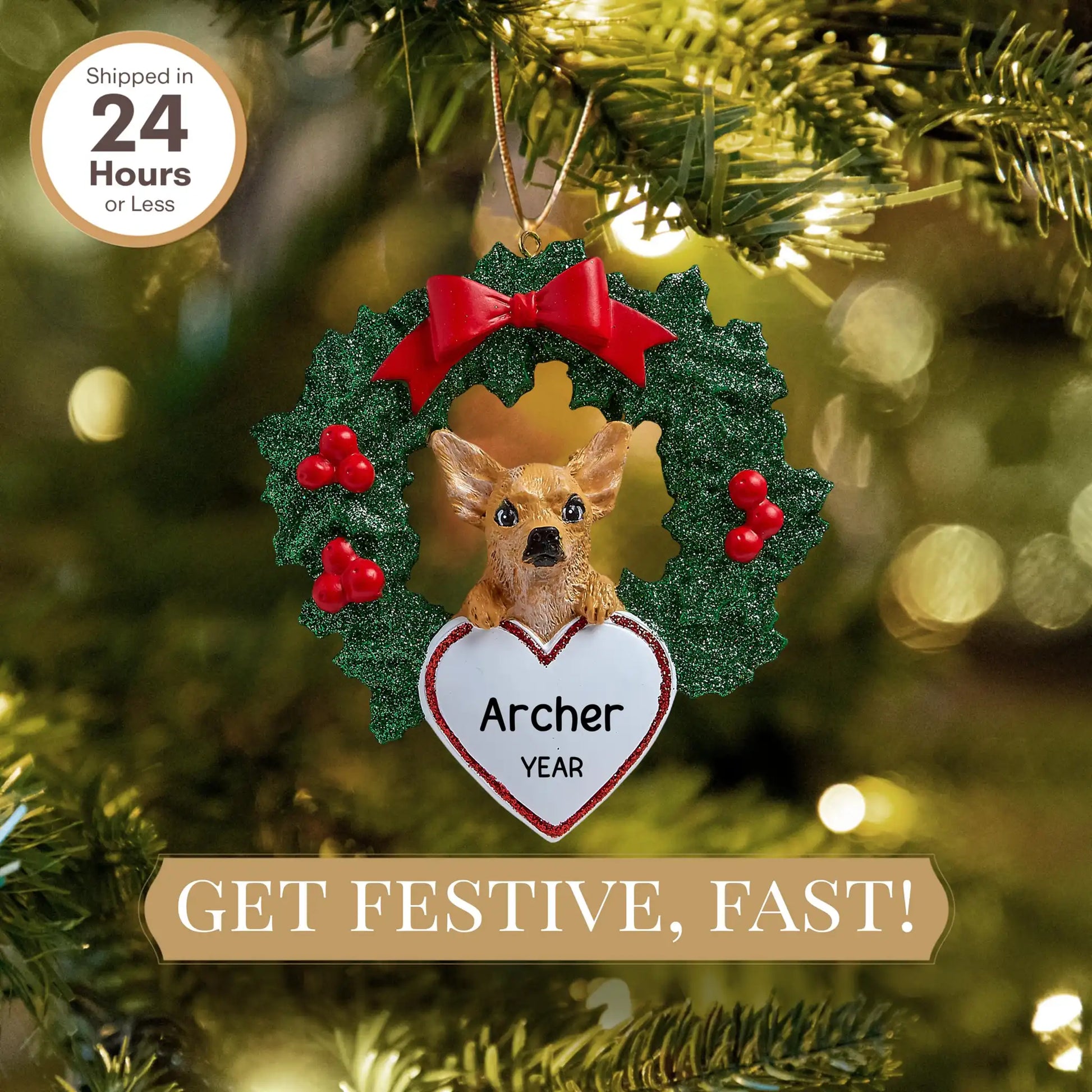 Réplica de chihuahua pintada a mano con corona navideña y corazón blanco. Imprescindible para quienes tienen o aman a los chihuahuas. Nuestros peludos amigos son una parte fundamental de nuestras familias y merecen su propio recuerdo para el árbol de Navidad.