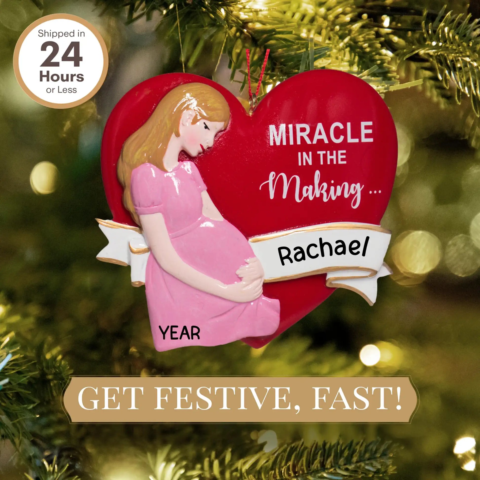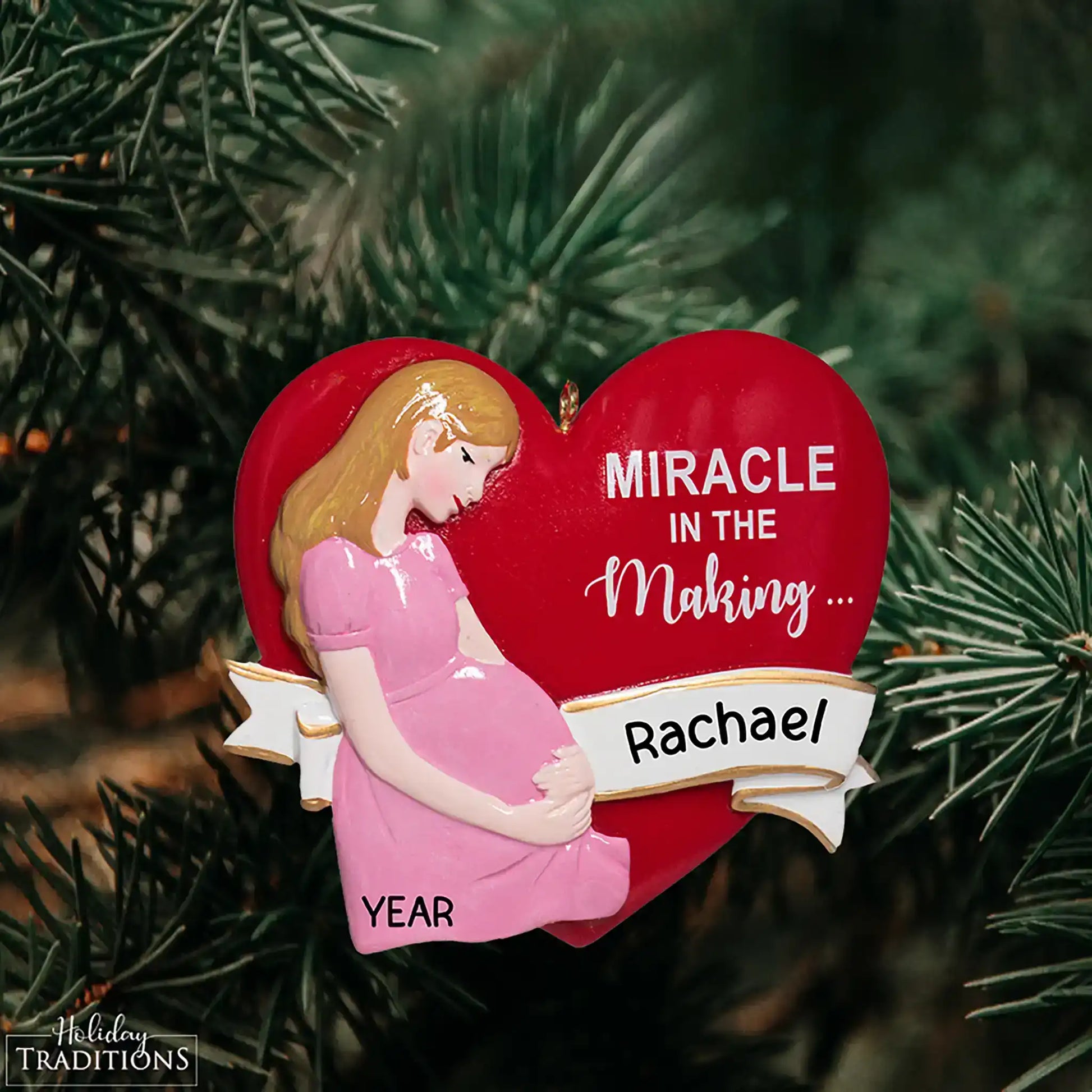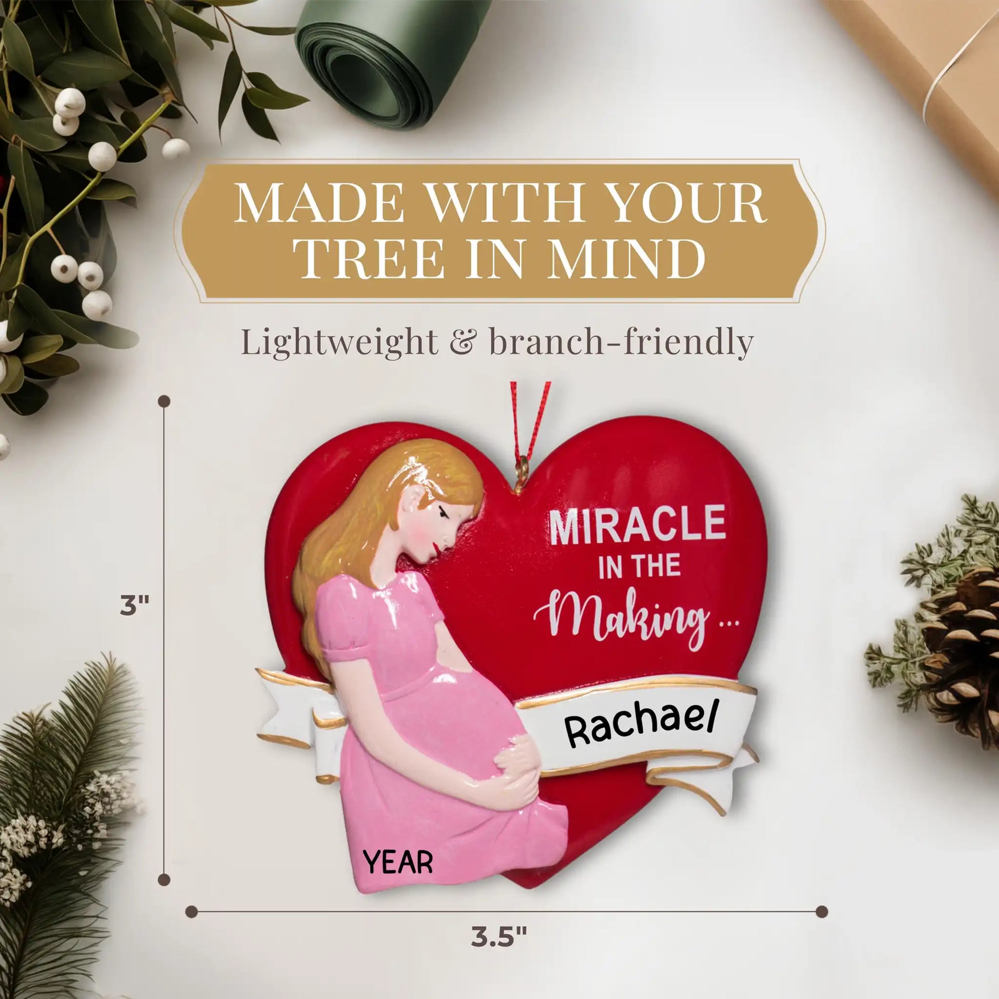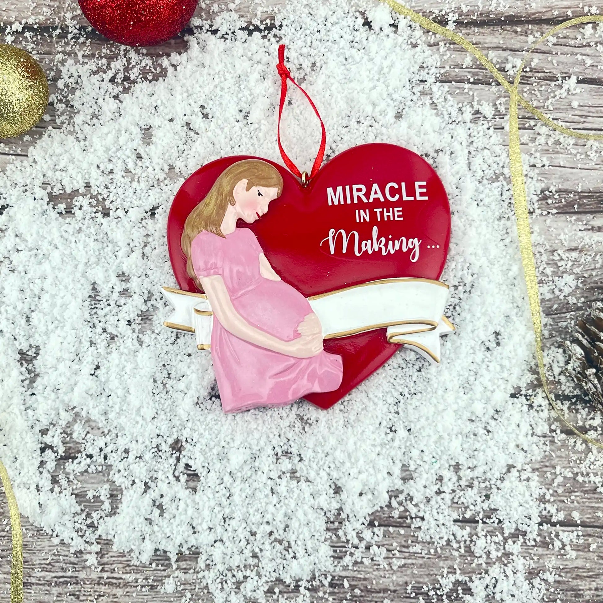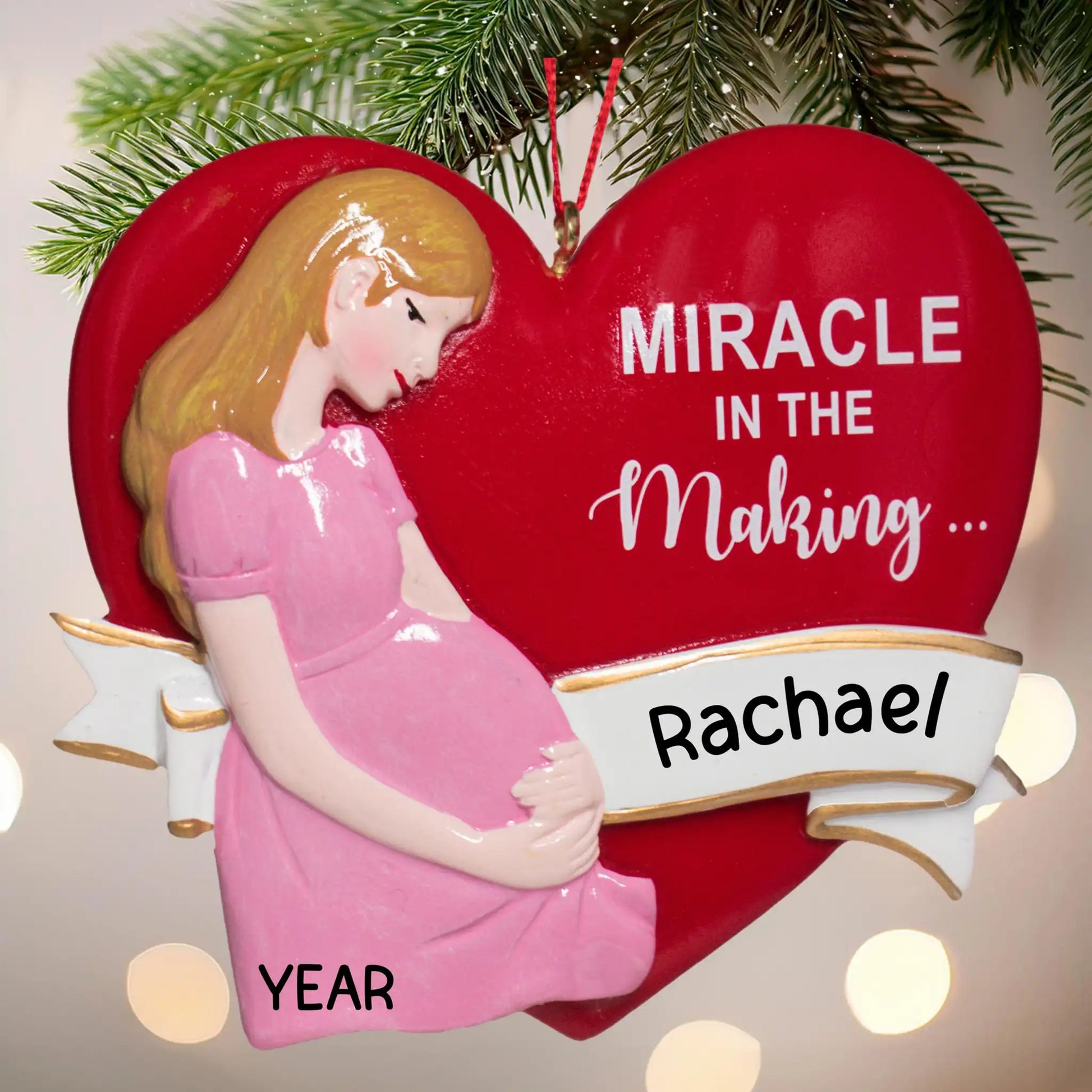 Nuestro adorable adorno navideño para futuras mamás presenta a una futura mamá sosteniendo su barriguita. El corazón rojo tiene la frase "Milagro en ciernes..." preescrita y está listo para tu árbol de Navidad. ¡El regalo perfecto para futuras mamás! ¡Añade el nombre y el año gratis!