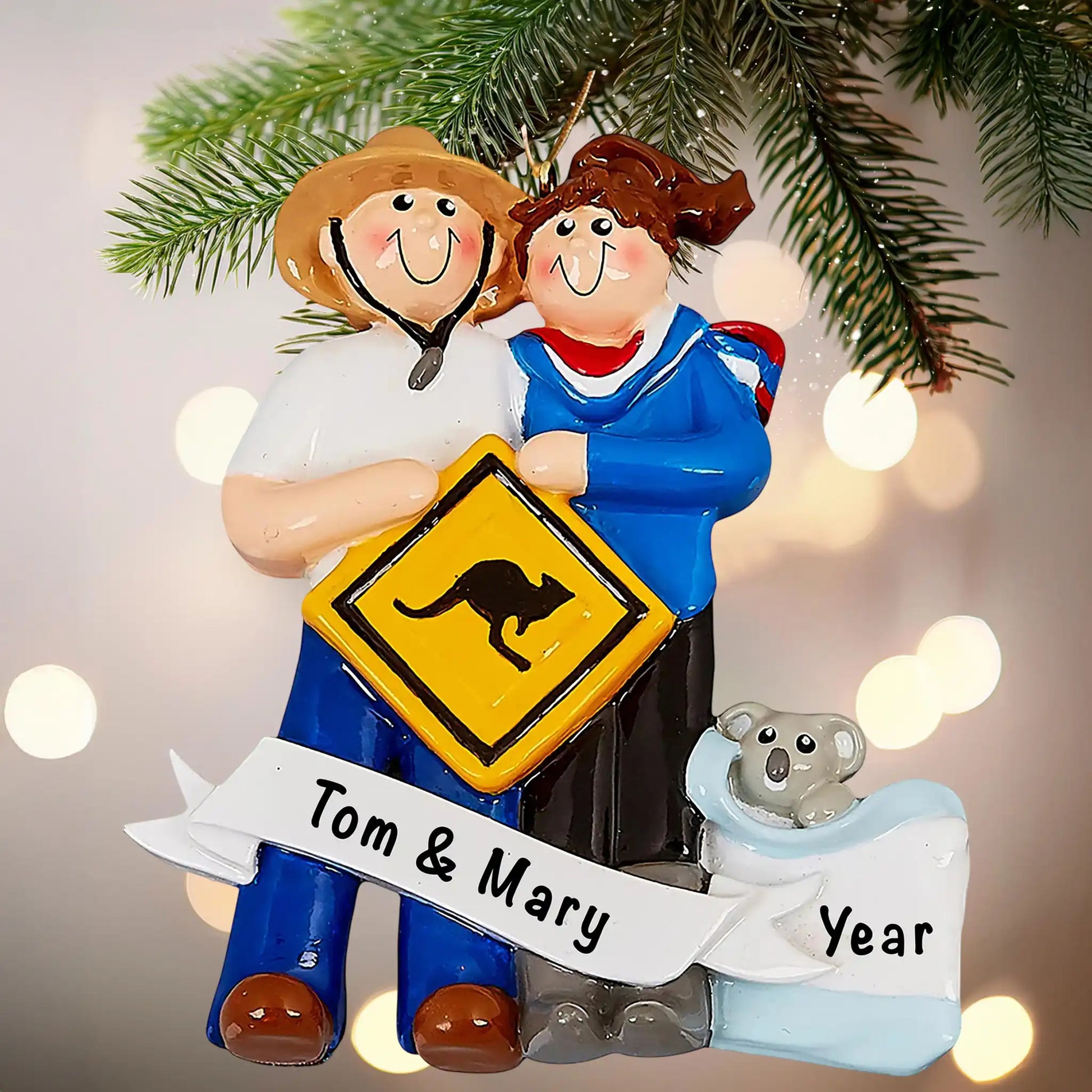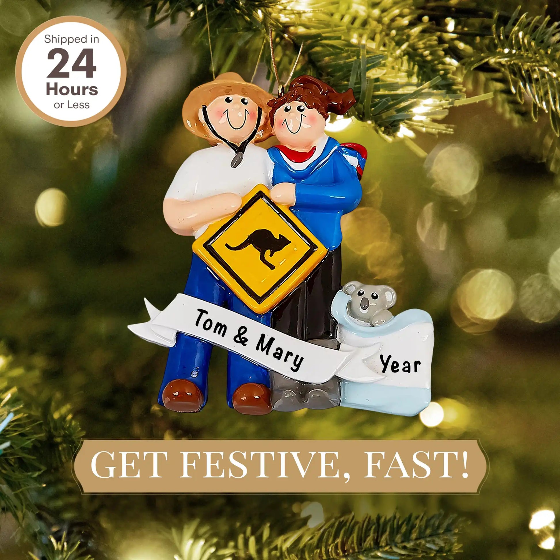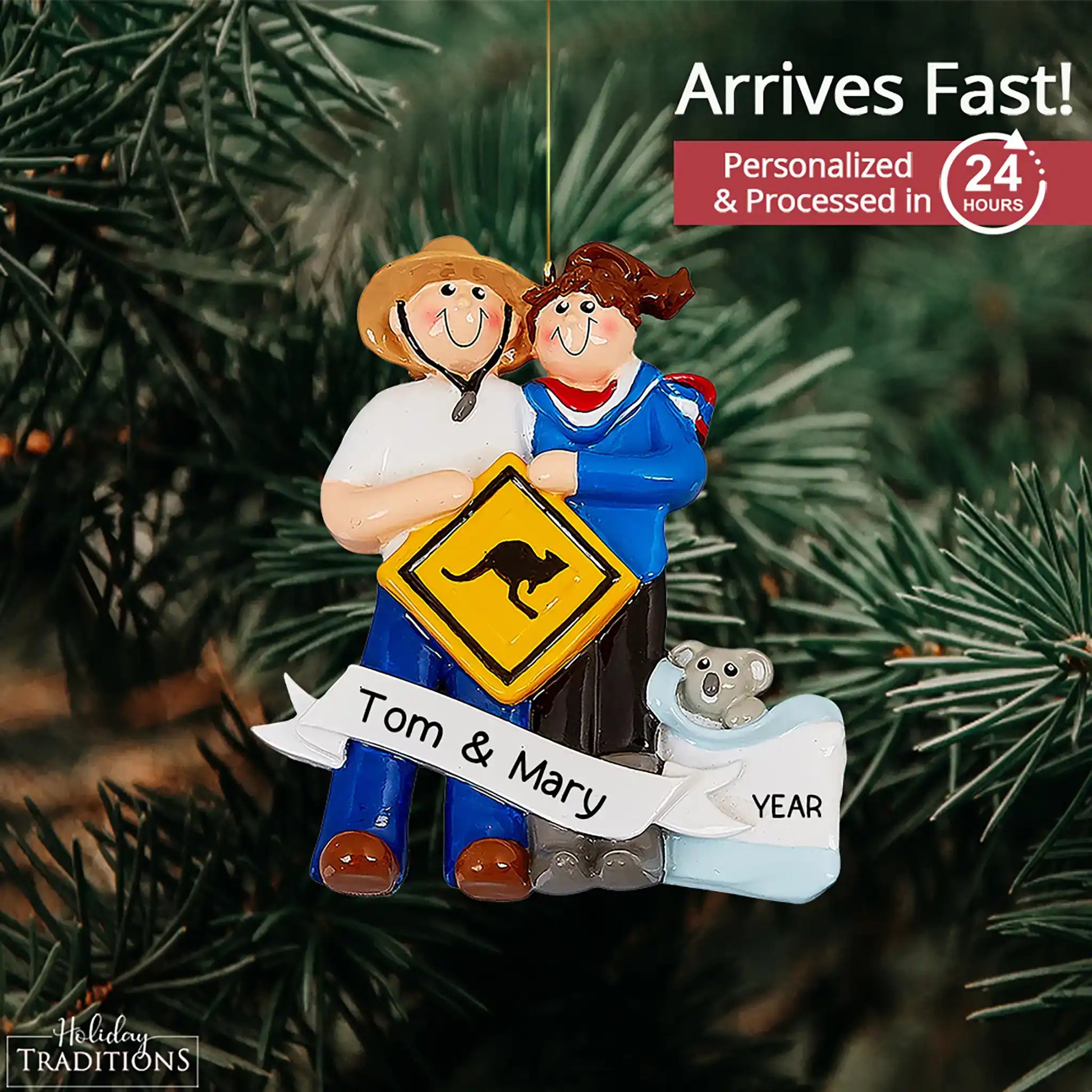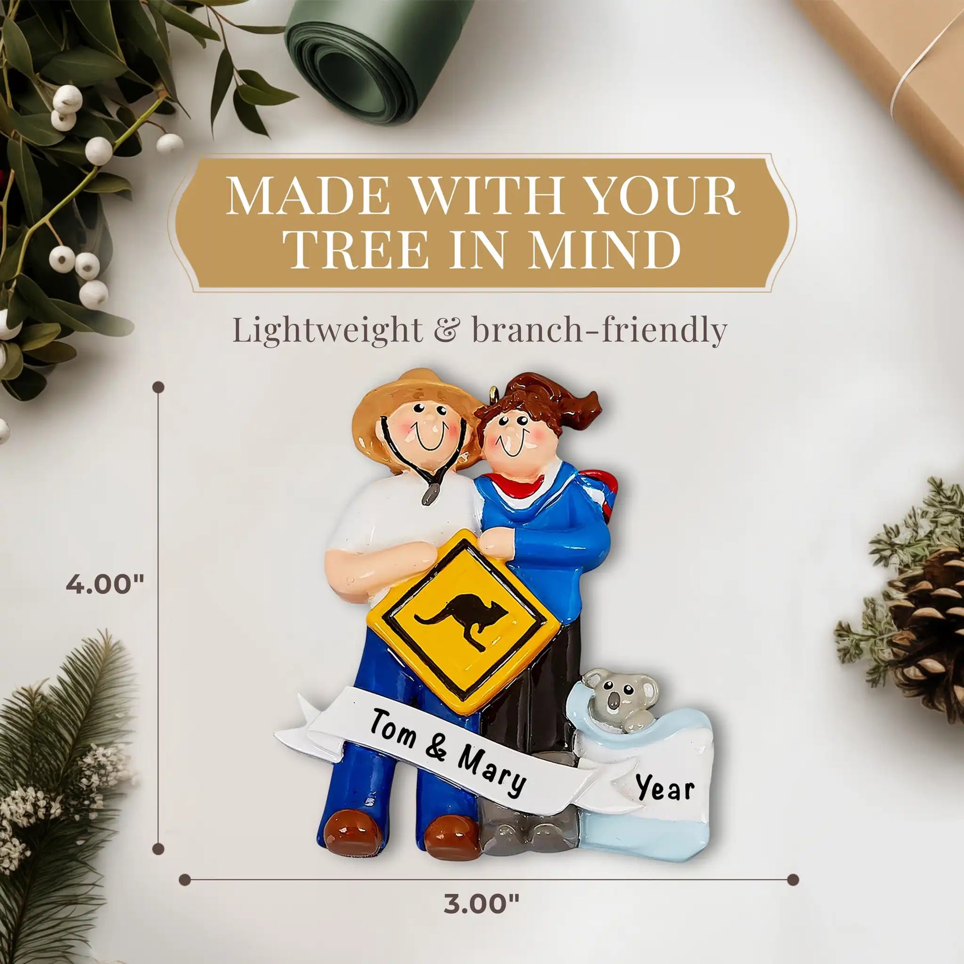 Nuestro adorno navideño personalizado "Amor en Australia" es el recuerdo perfecto de un viaje a Australia. Presenta una pareja sosteniendo un cartel de canguro y una cría de koala. Añade un nombre para conmemorar un viaje especial.
