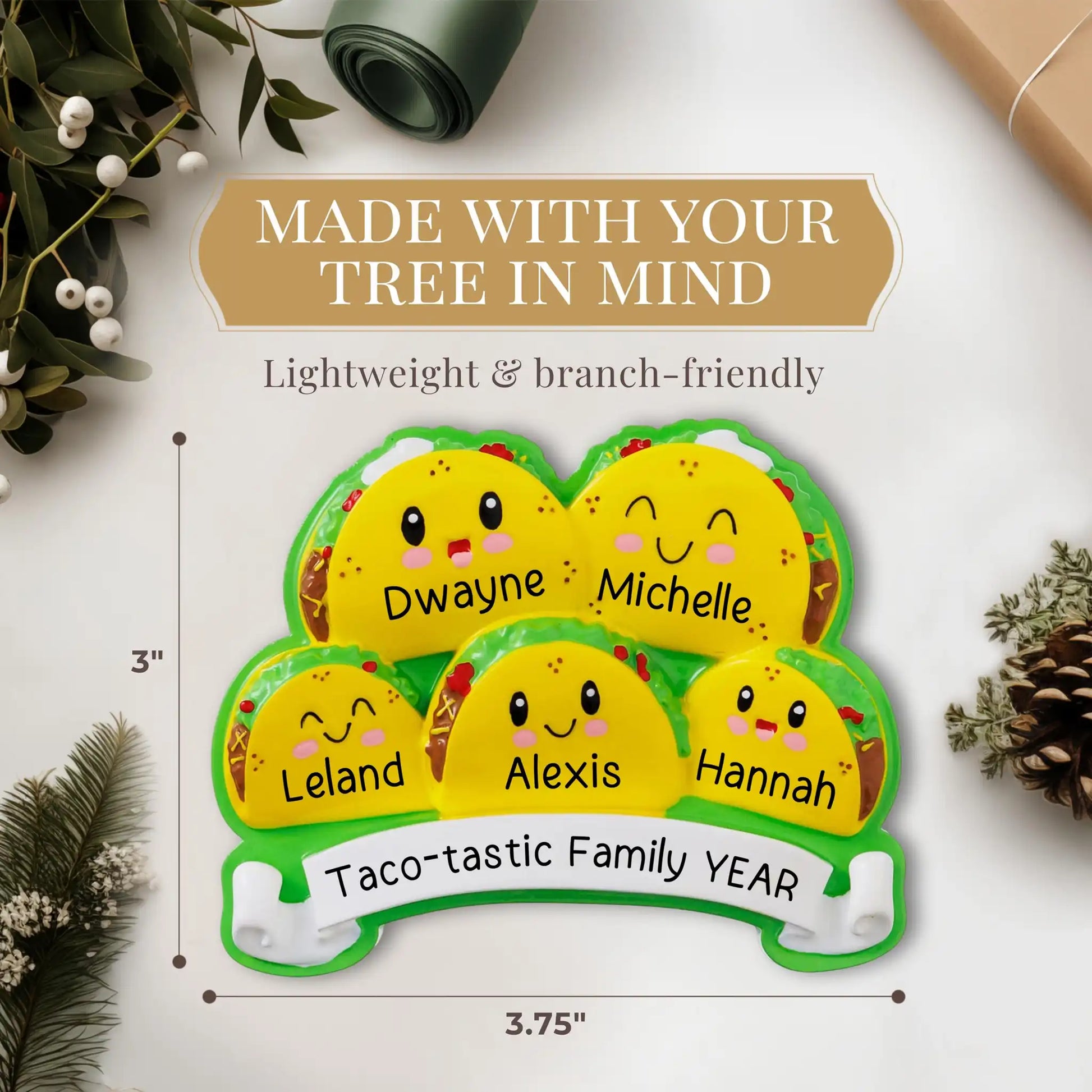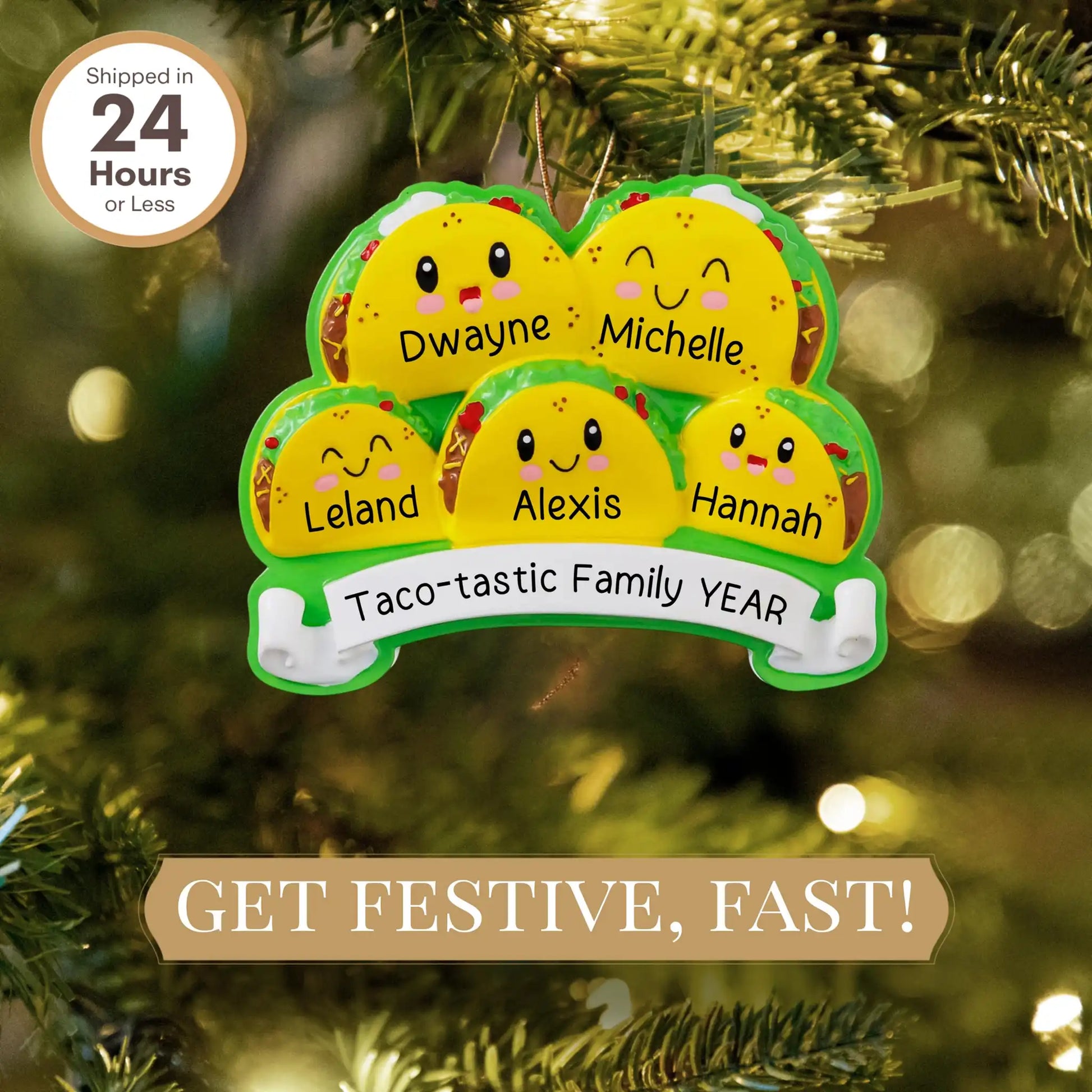 Imagina la alegría en sus caras al ver sus nombres en estos adorables tacos sonrientes, listos para darle vida a la decoración navideña. Añade un lema familiar divertido como "Familia Taco-tástica" y el año, y tendrás un recuerdo memorable que será un éxito año tras año. ¿Lo mejor? Lo personalizamos, envolvemos para regalo y lo enviamos en 24 horas, ¡así que tu tribu de tacos estará lista para el árbol en un abrir y cerrar de ojos!