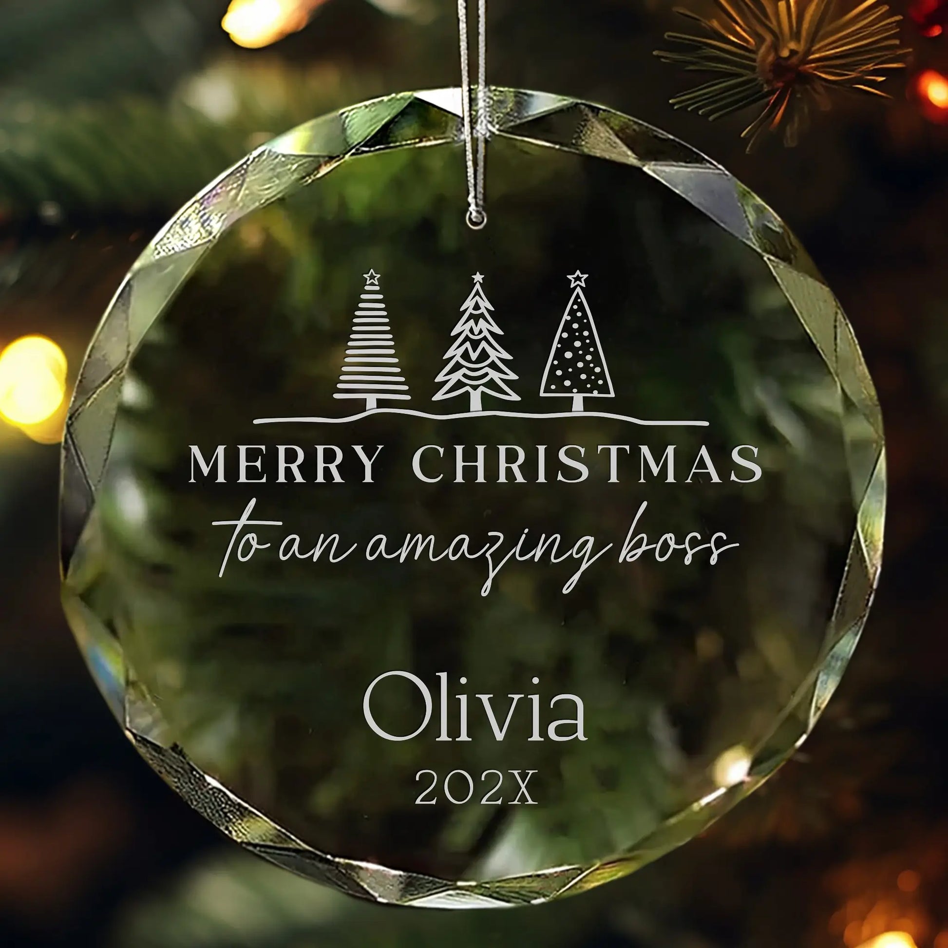 This beautifully crafted beveled glass ornament features a trio of festive Christmas trees and a thoughtful message that stands out with crisp laser engraving. Personalized with your boss’s name and the year, it becomes a meaningful keepsake they’ll treasure season after season. Its polished clarity catches holiday lights beautifully, and with fast shipping, it’s an easy yet truly thoughtful gift from the whole team.