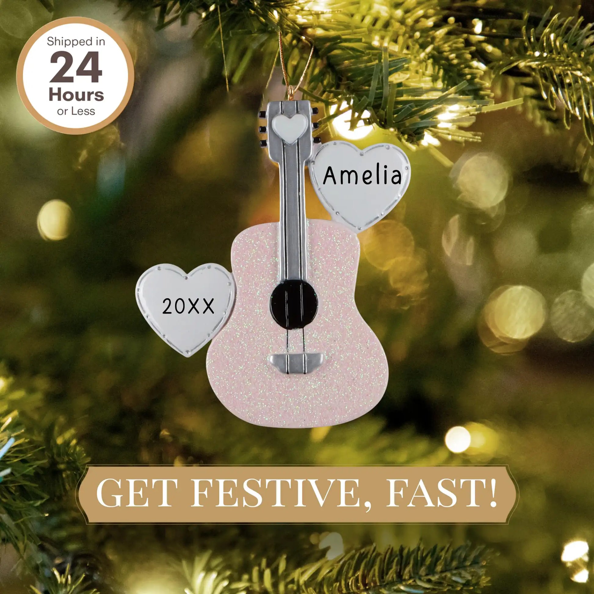 ¡Dale vida a las fiestas con un adorno de guitarra rosa con brillantina personalizado!