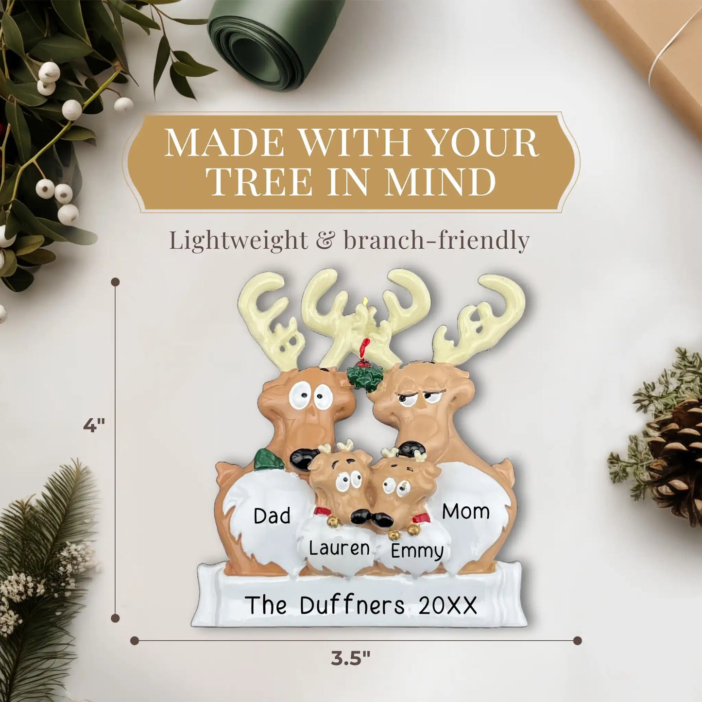 Cada adorno tiene un área de personalización con un número máximo de caracteres. Estos son necesarios para asegurar que cada nombre quepa en el espacio especificado.
