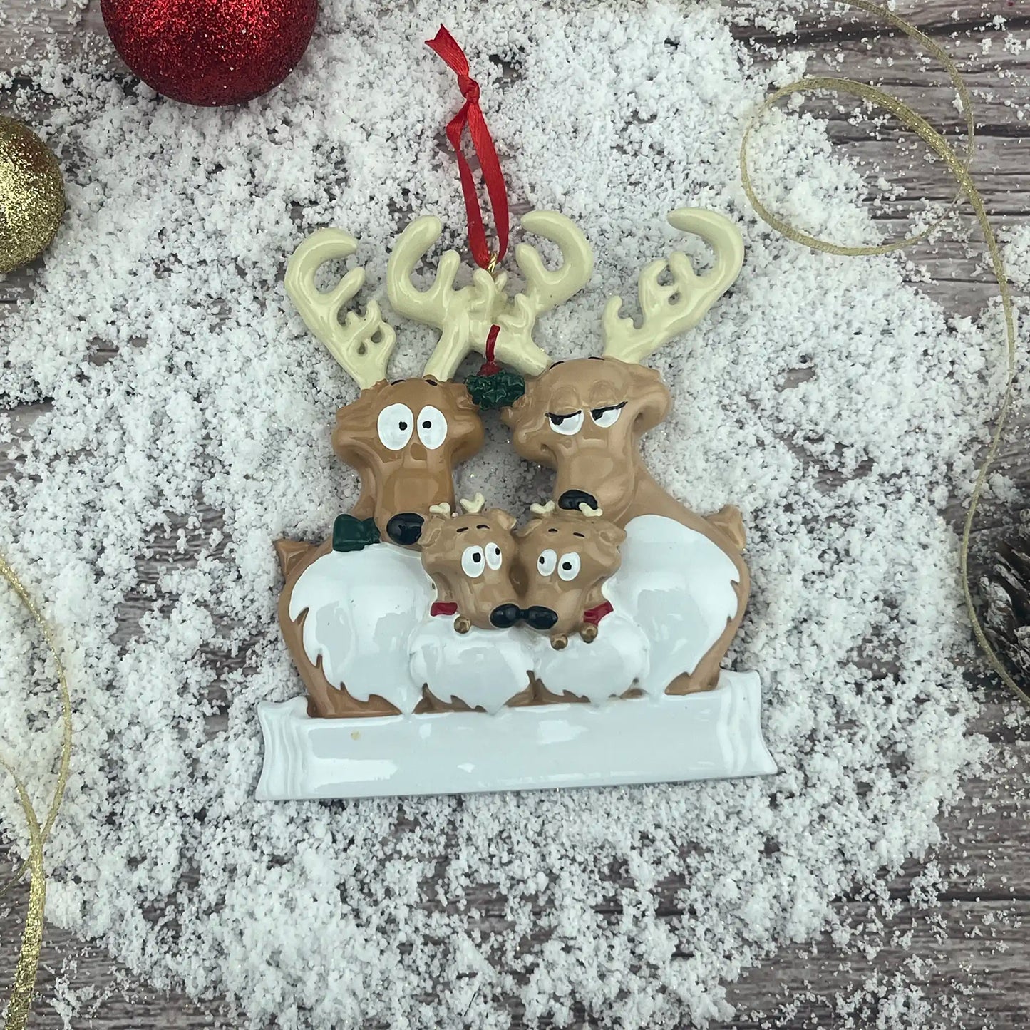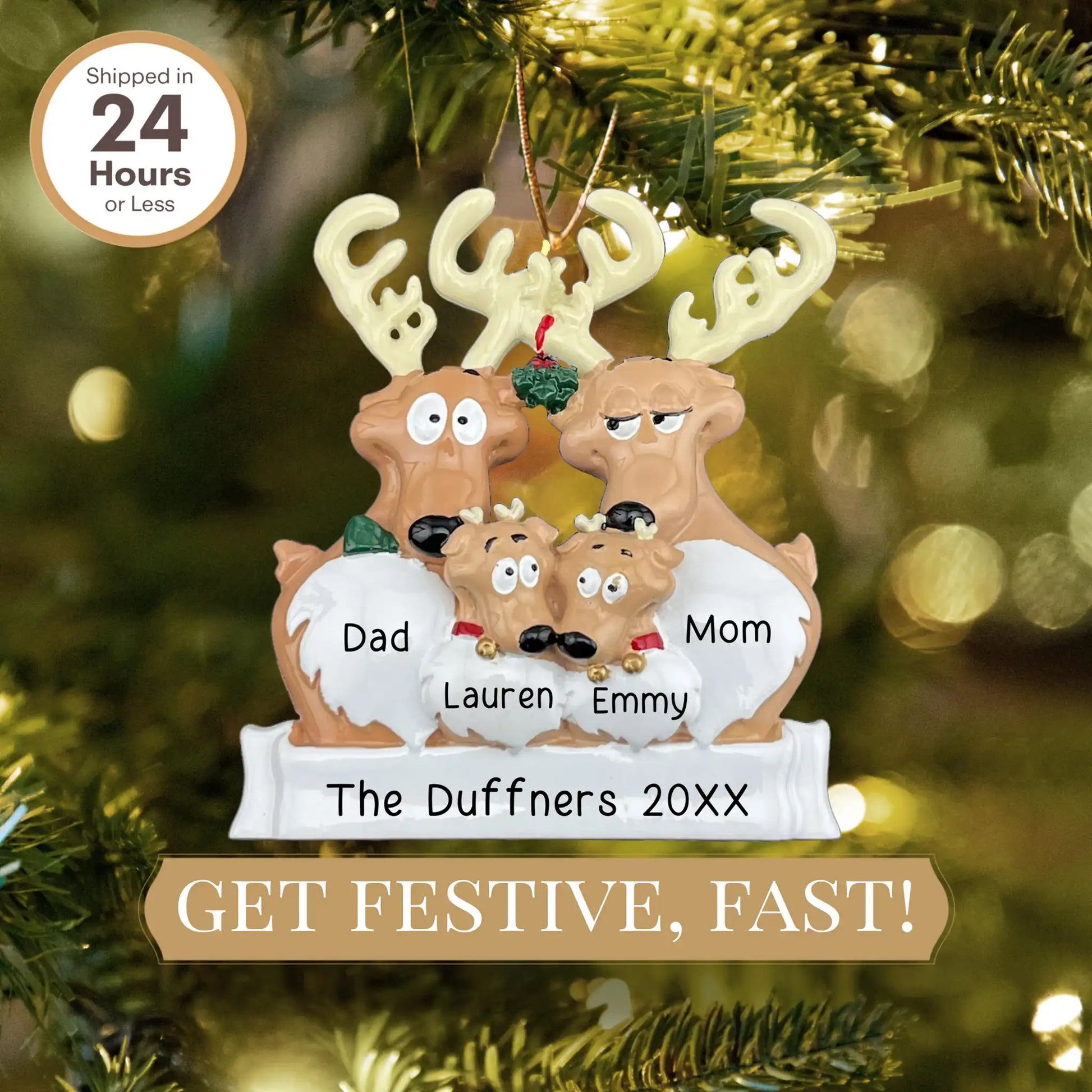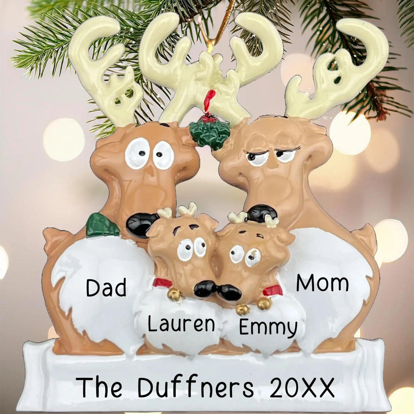 Al introducir la información de personalización, los nombres aparecerán en el adorno en blanco para mostrarte cómo quedará. Ten en cuenta que esto es solo una maqueta; el producto final luce mucho mejor.