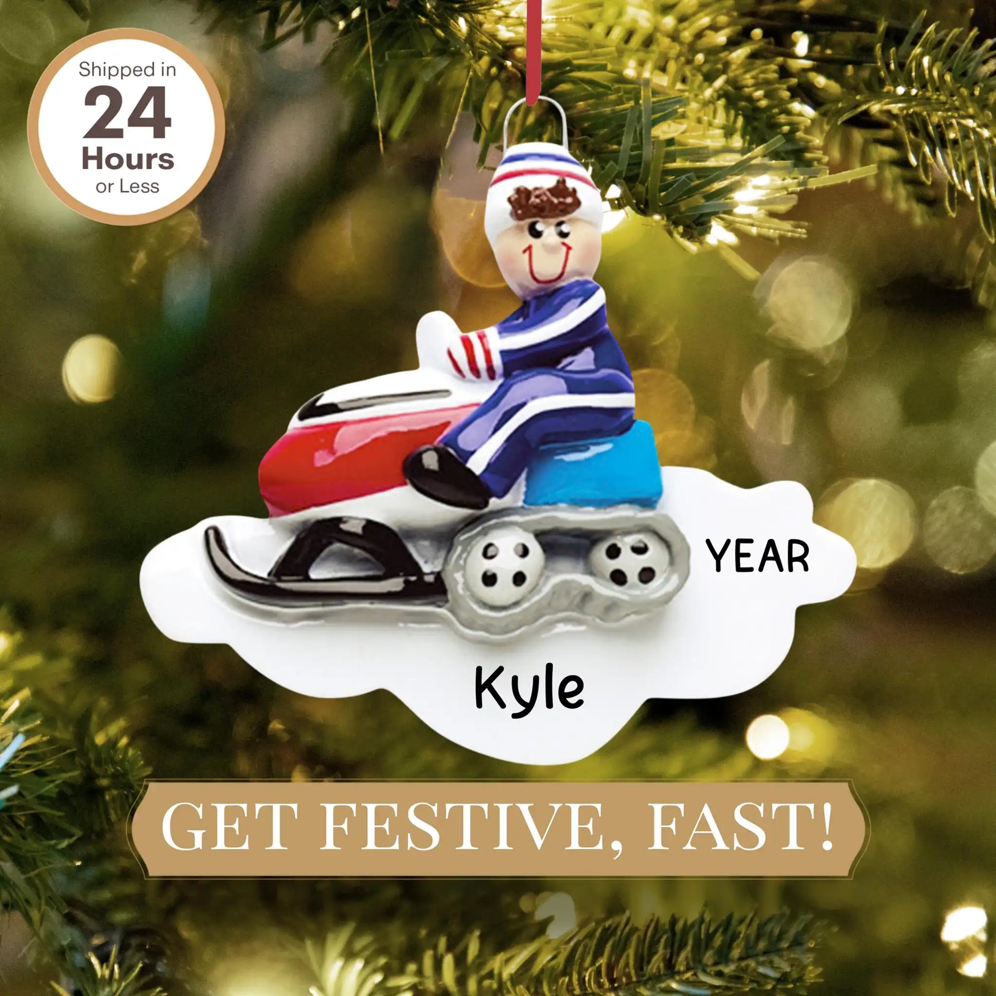 Adorno navideño personalizado para moto de nieve con un conductor deslizándose por la nieve. Añade nombre y año a este recuerdo especial.