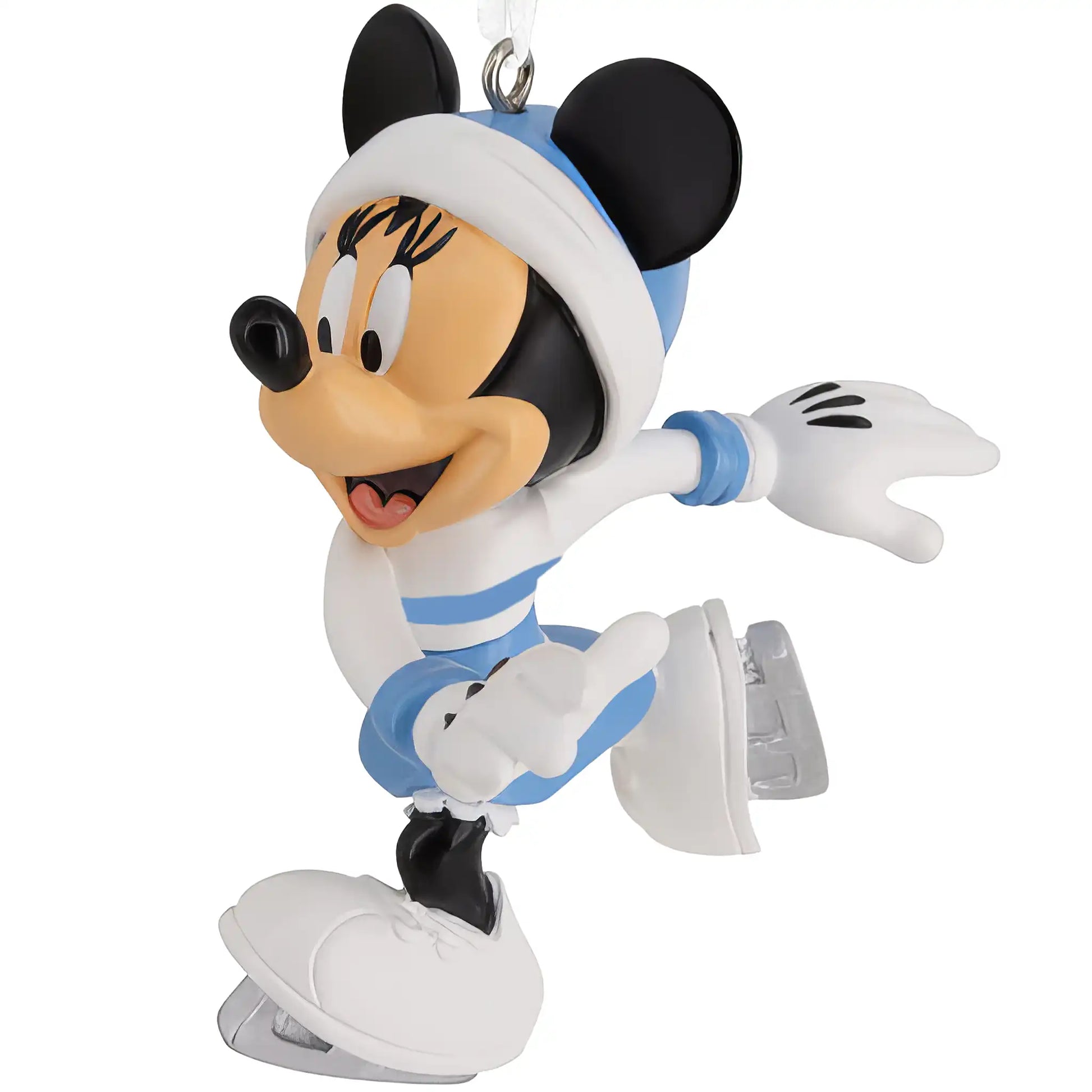 Minnie Mouse is all smiles as she twirls across the ice in her adorable blue and white skating outfit.
