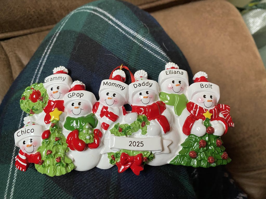 This ornament captures the joy and chaos of a full house at the holidays. Each snowman brings its own cheerful details, from tiny mittens to bright scarves and decorated trees.