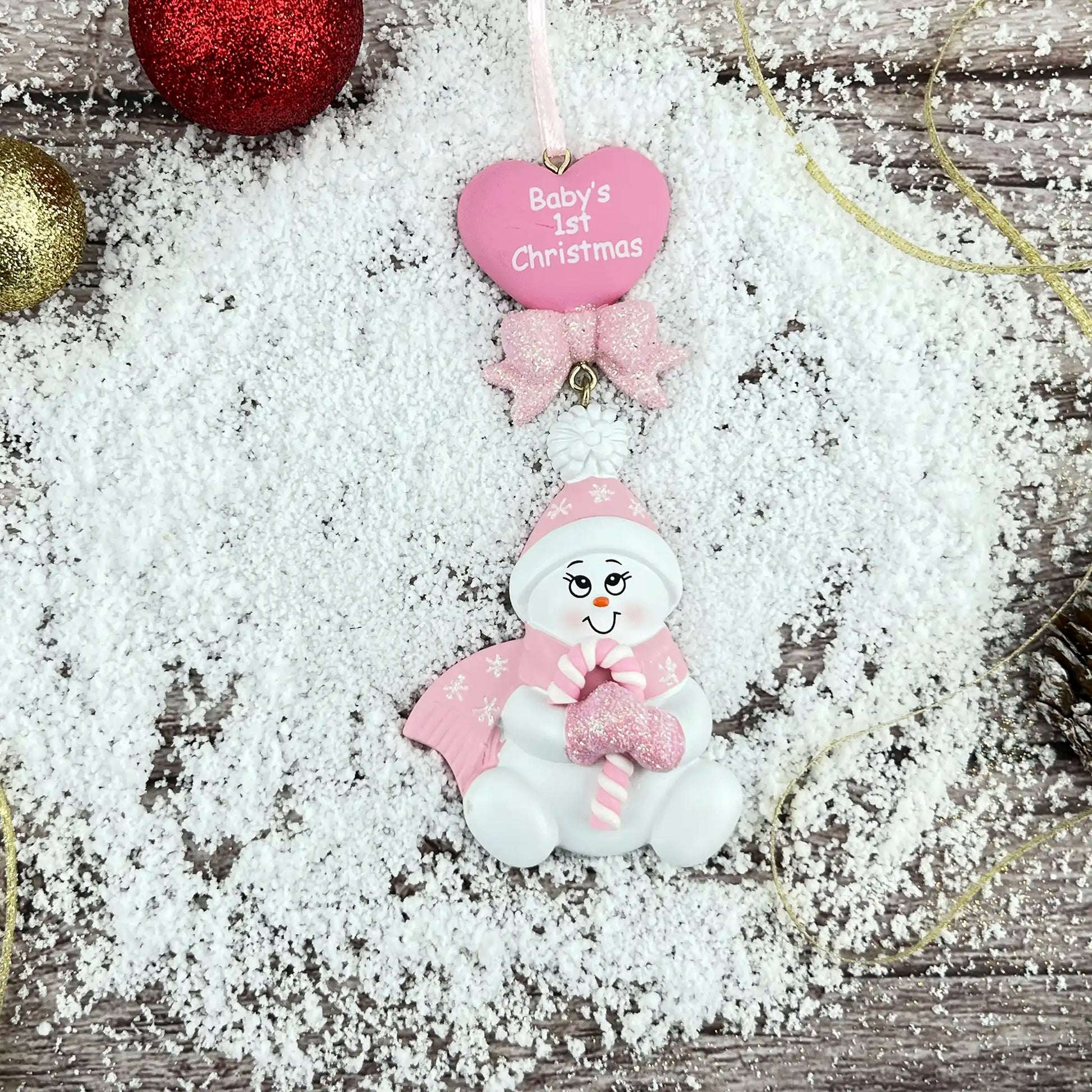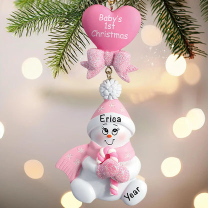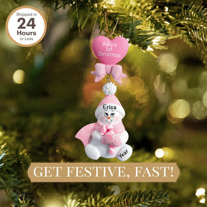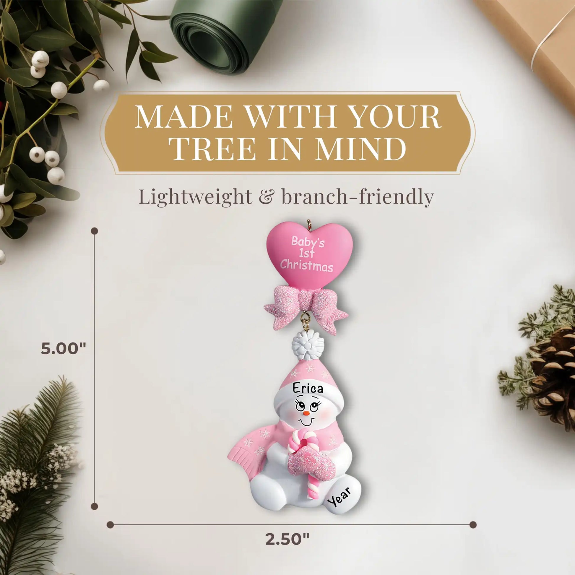 Extraordinarily adorable snow baby wearing a little pink Christmas cap, and scarf with matching mittens, cuddling a pink candy cane! This little lady is delicately dangling from a pink heart printed with "Baby's 1st Christmas" and will stand out wherever she is placed on your tree! The year fits perfectly in her little snow foot, and her name will look beyond precious in the hat!