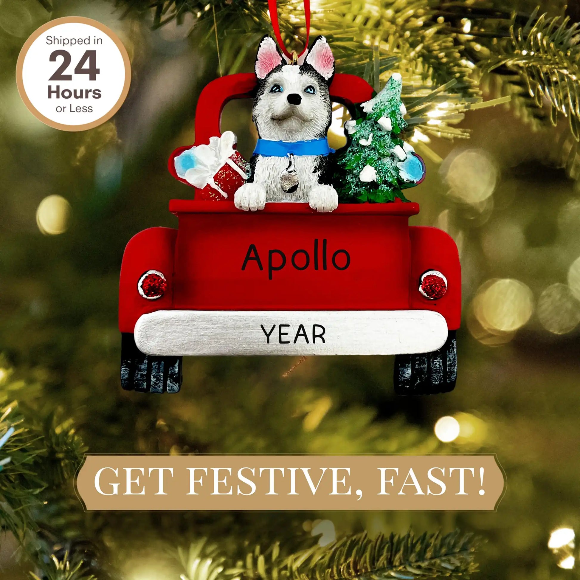 Add a touch of holiday magic to your festive season with our exquisite Siberian husky in vintage truck ornament. This finely crafted masterpiece is more than just a decoration; it's a cherished keepsake that will warm the hearts of dog lovers everywhere.