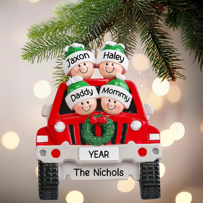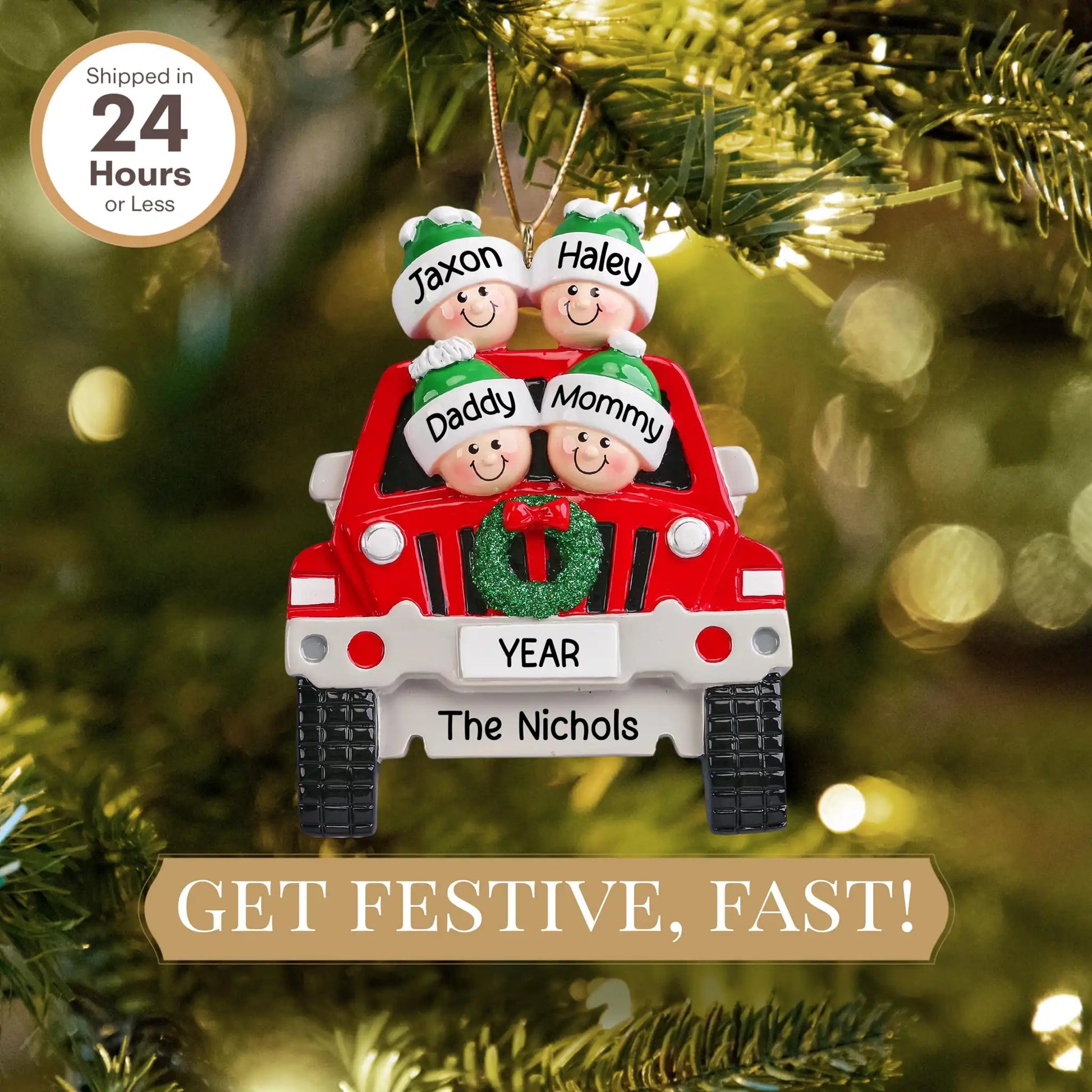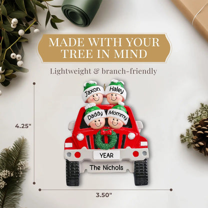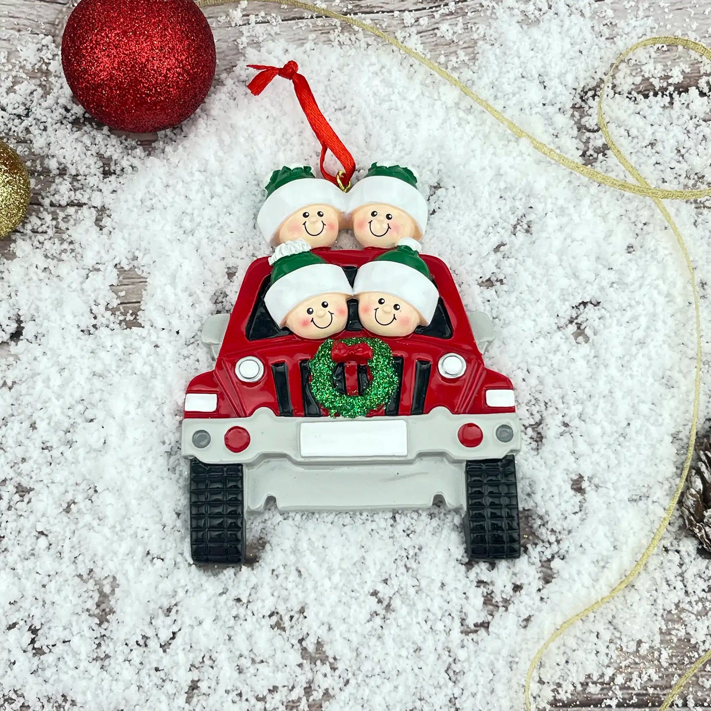 The best thing about our ornament is that it can be customized. You're all seated in an SUV, smiling and waving, about to embark on an unforgettable journey with your family. The ornament allows room to add your family's names, ensuring each piece is unique to you. Furthermore, its handcrafted nature guarantees individuality, enhancing your family's distinct personalities.